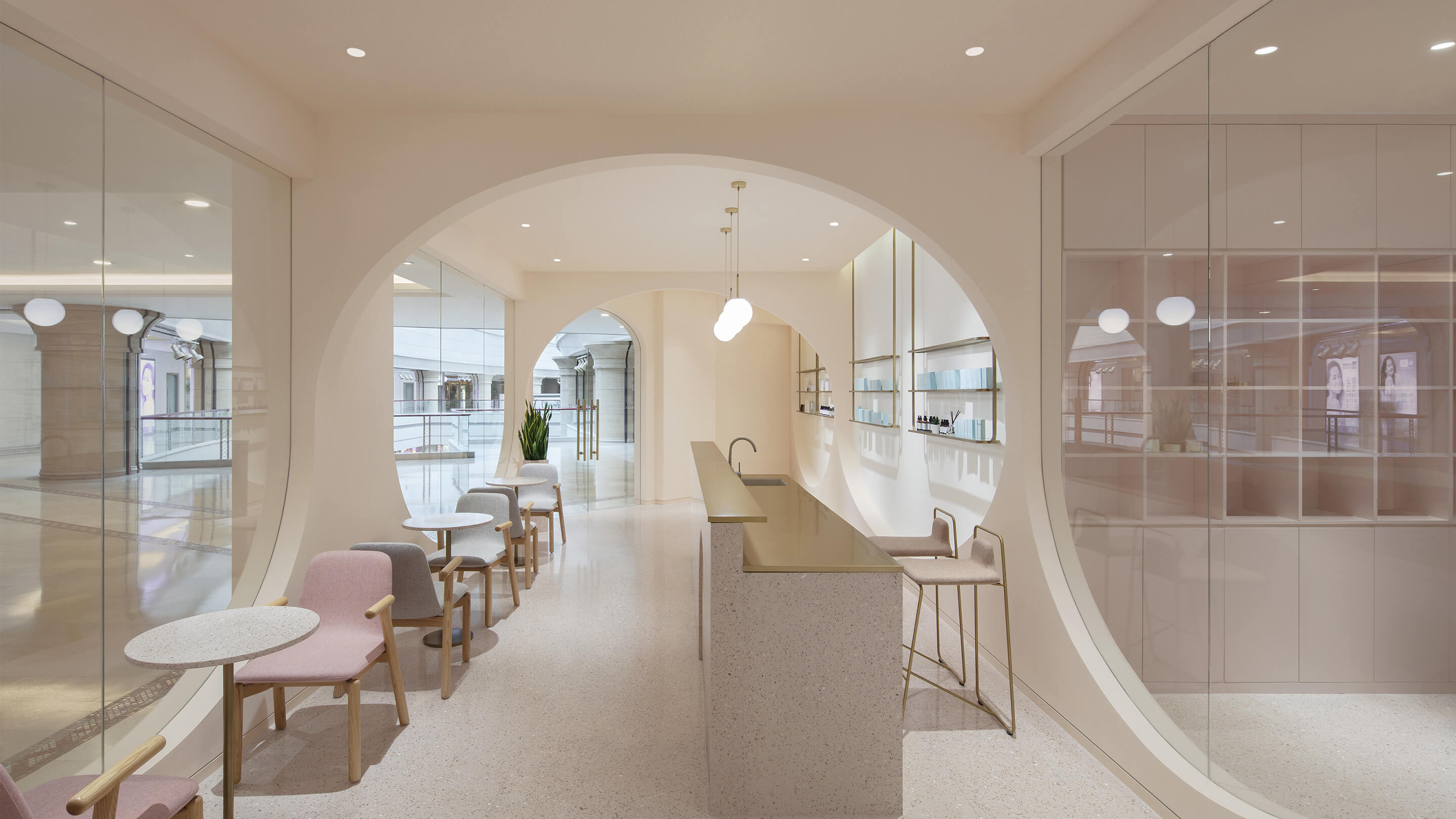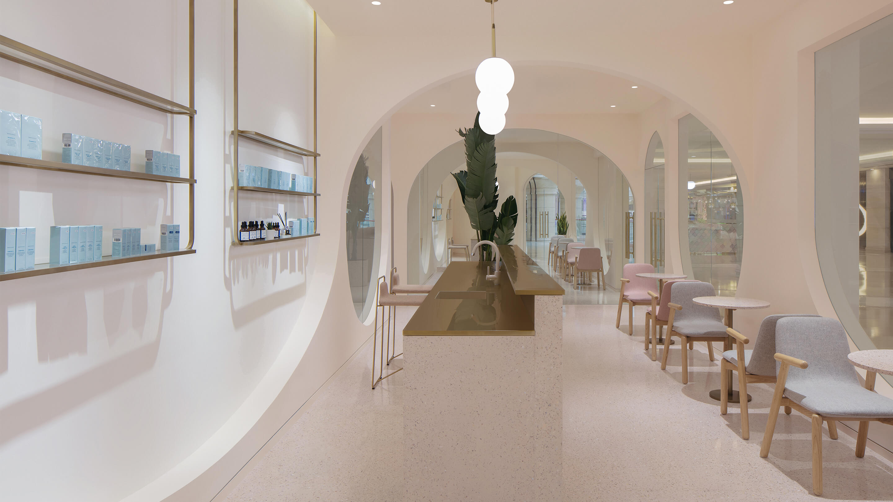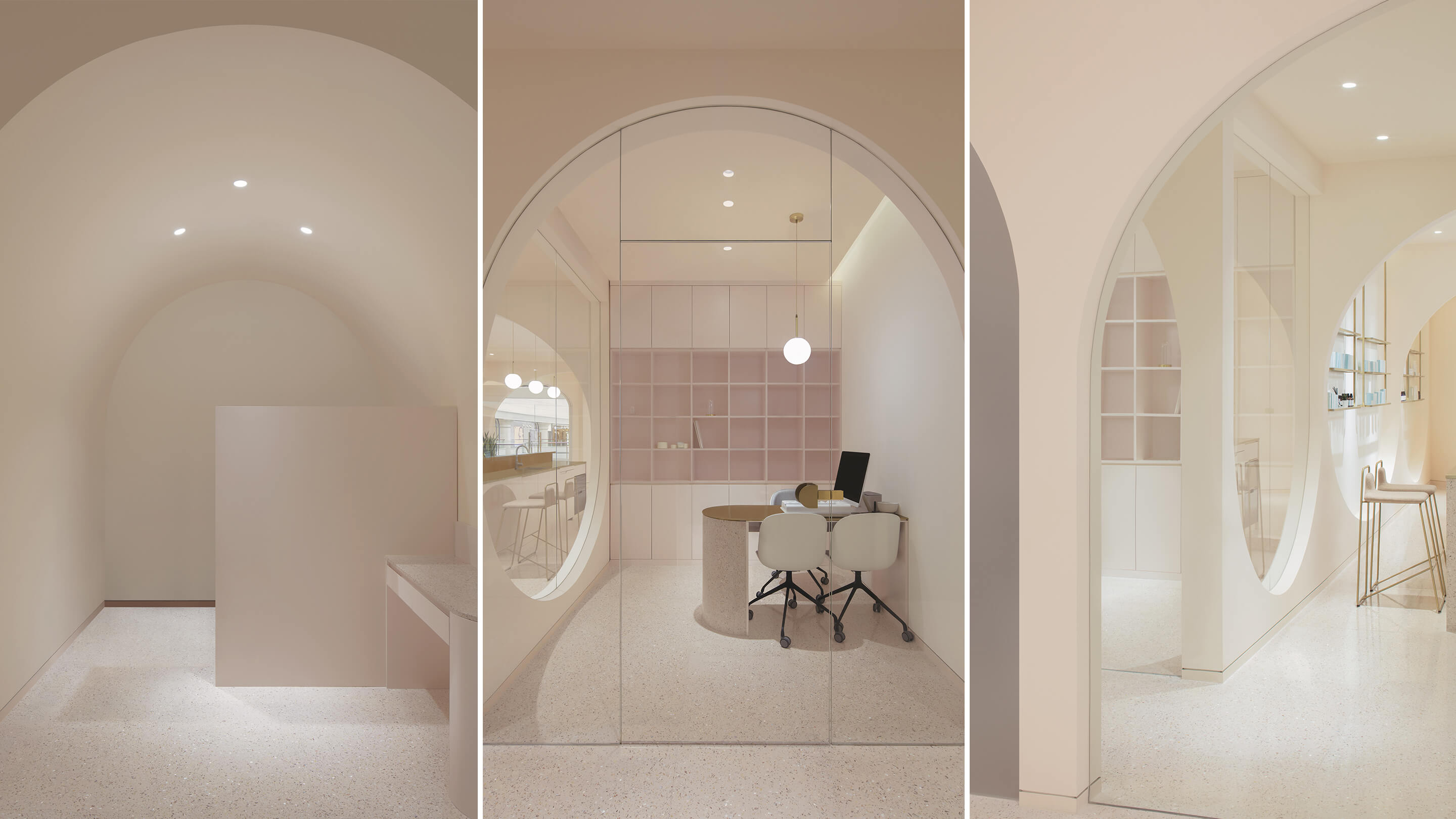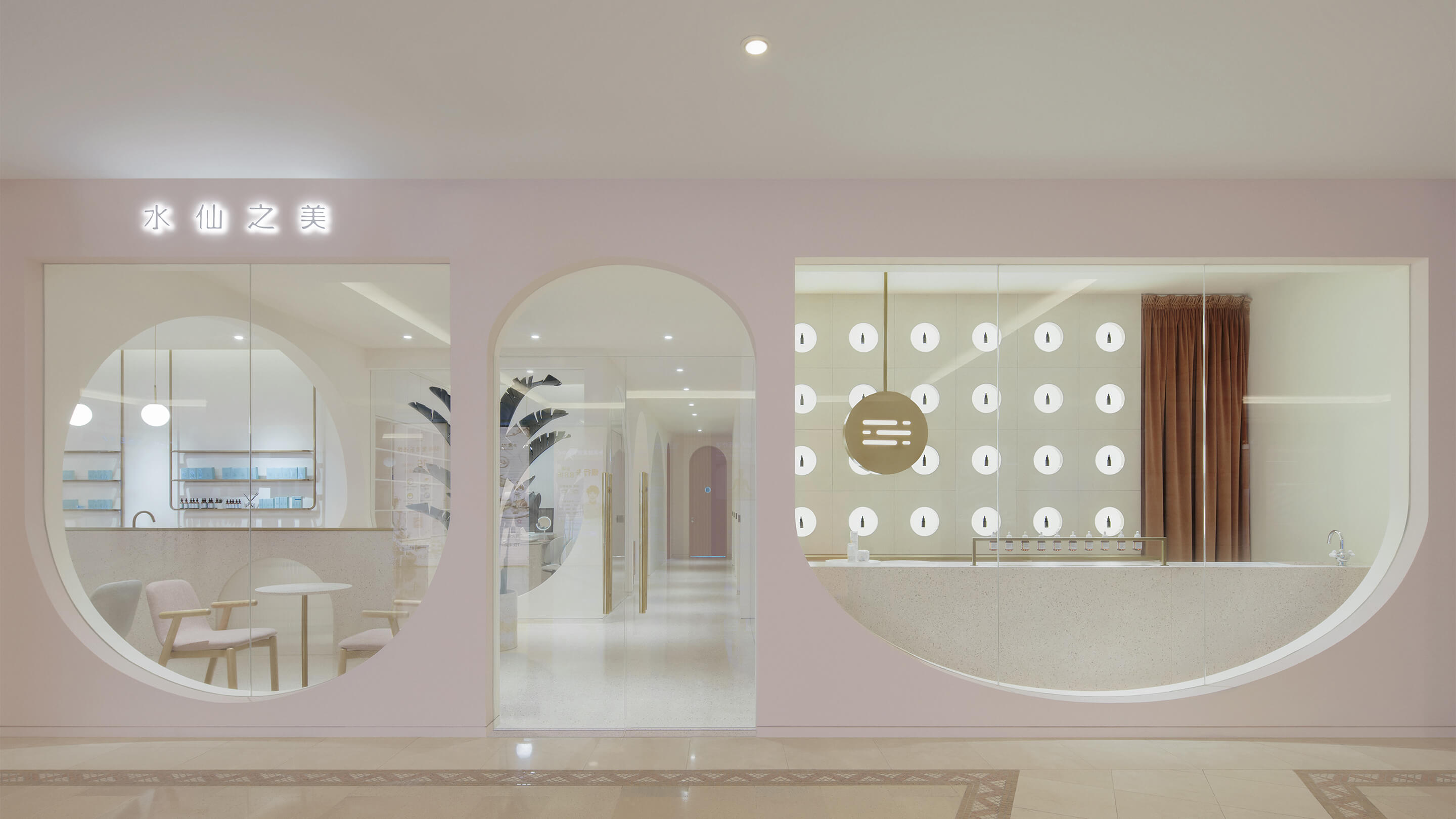 第三是对空间色彩的调整,美容行业是一个非常女性化行业,水仙的主要顾客人群也以女性为主,所以设计的空间选用了粉色系的色彩体系,希望打破人们对美容店单调的白色空间的传统看法,粉色的空间配合拱形的造型,拉近人与空间的距离,创造出独特的安全感和归属感。