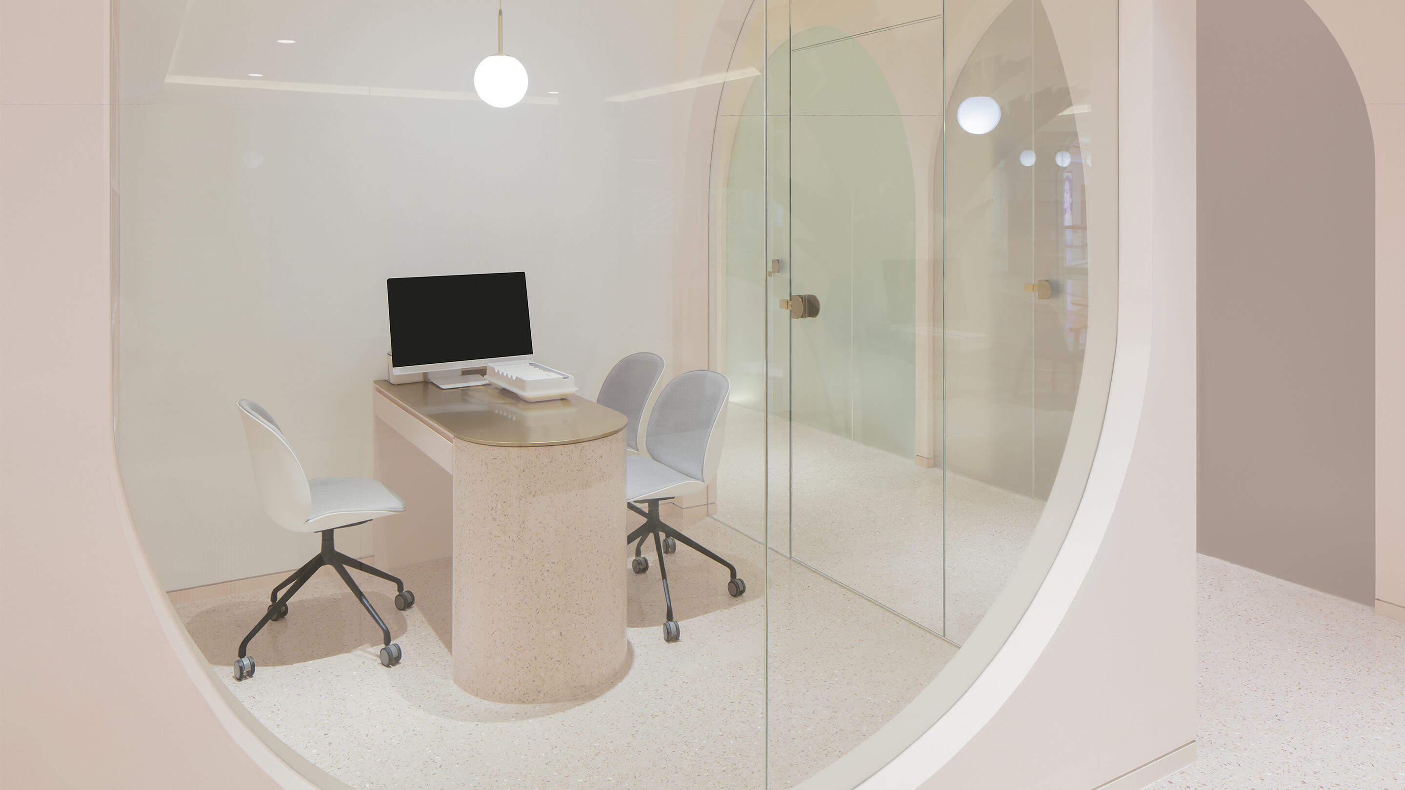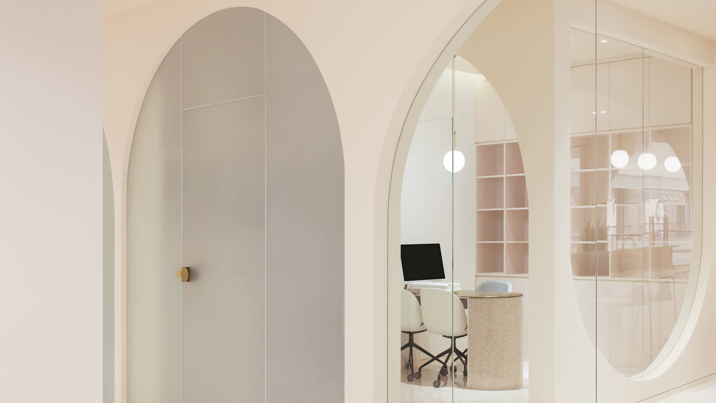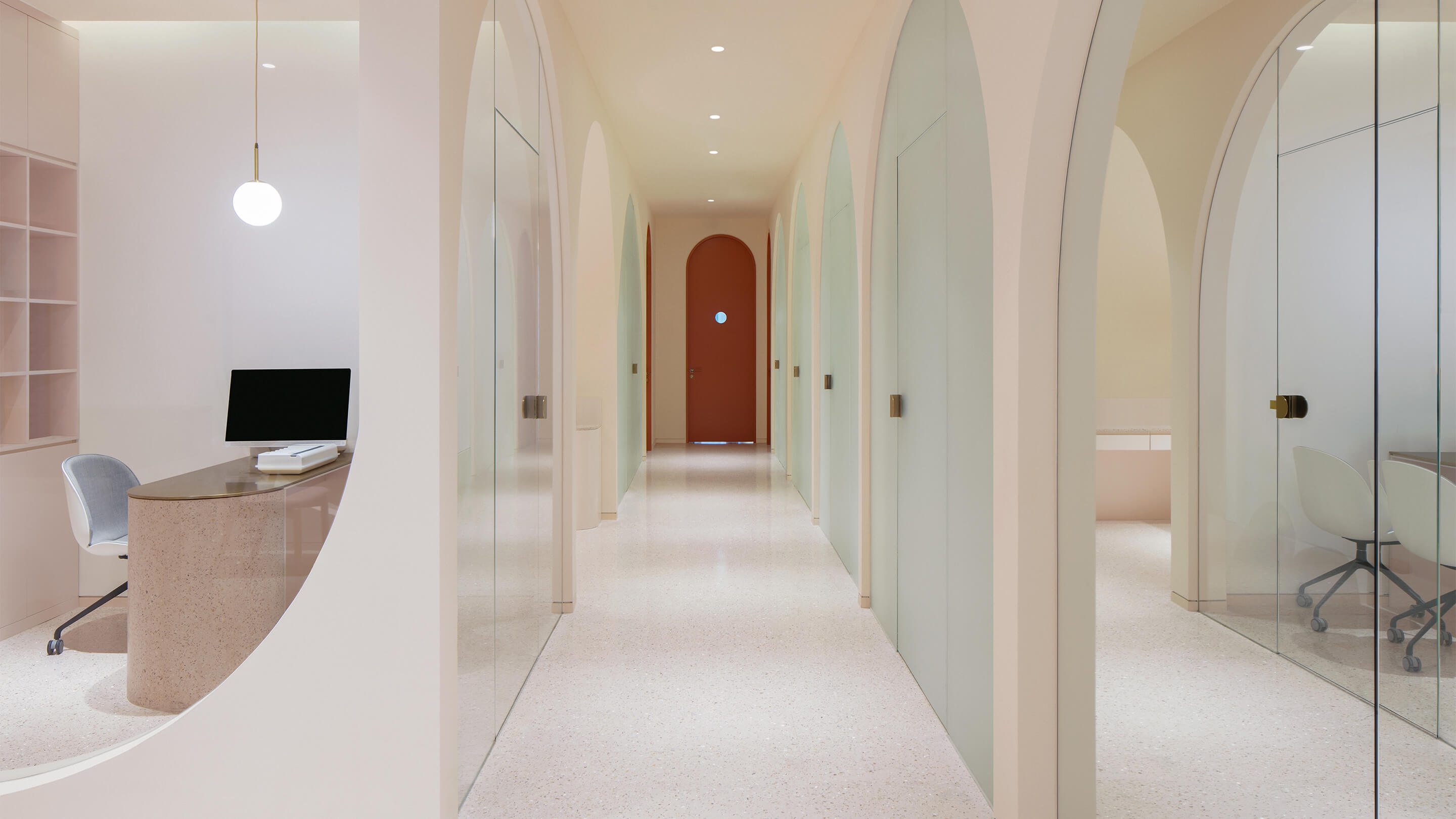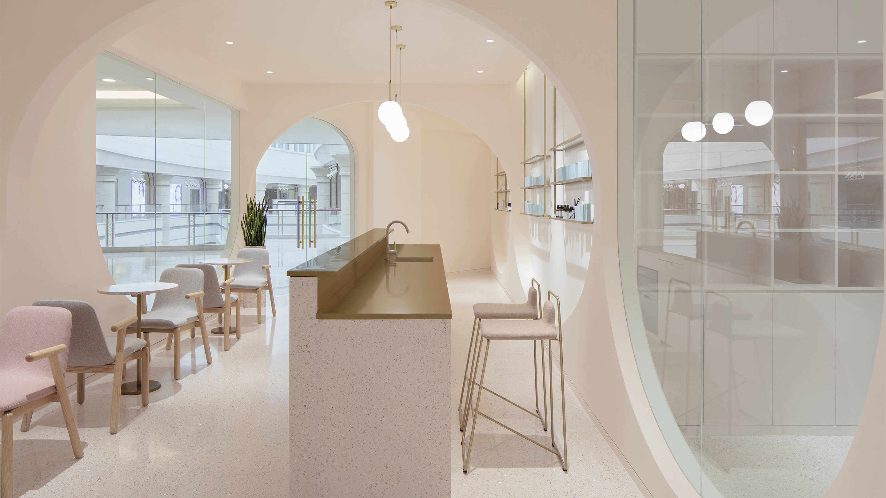 第三是对空间色彩的调整,美容行业是一个非常女性化行业,水仙的主要顾客人群也以女性为主,所以设计的空间选用了粉色系的色彩体系,希望打破人们对美容店单调的白色空间的传统看法,粉色的空间配合拱形的造型,拉近人与空间的距离,创造出独特的安全感和归属感。