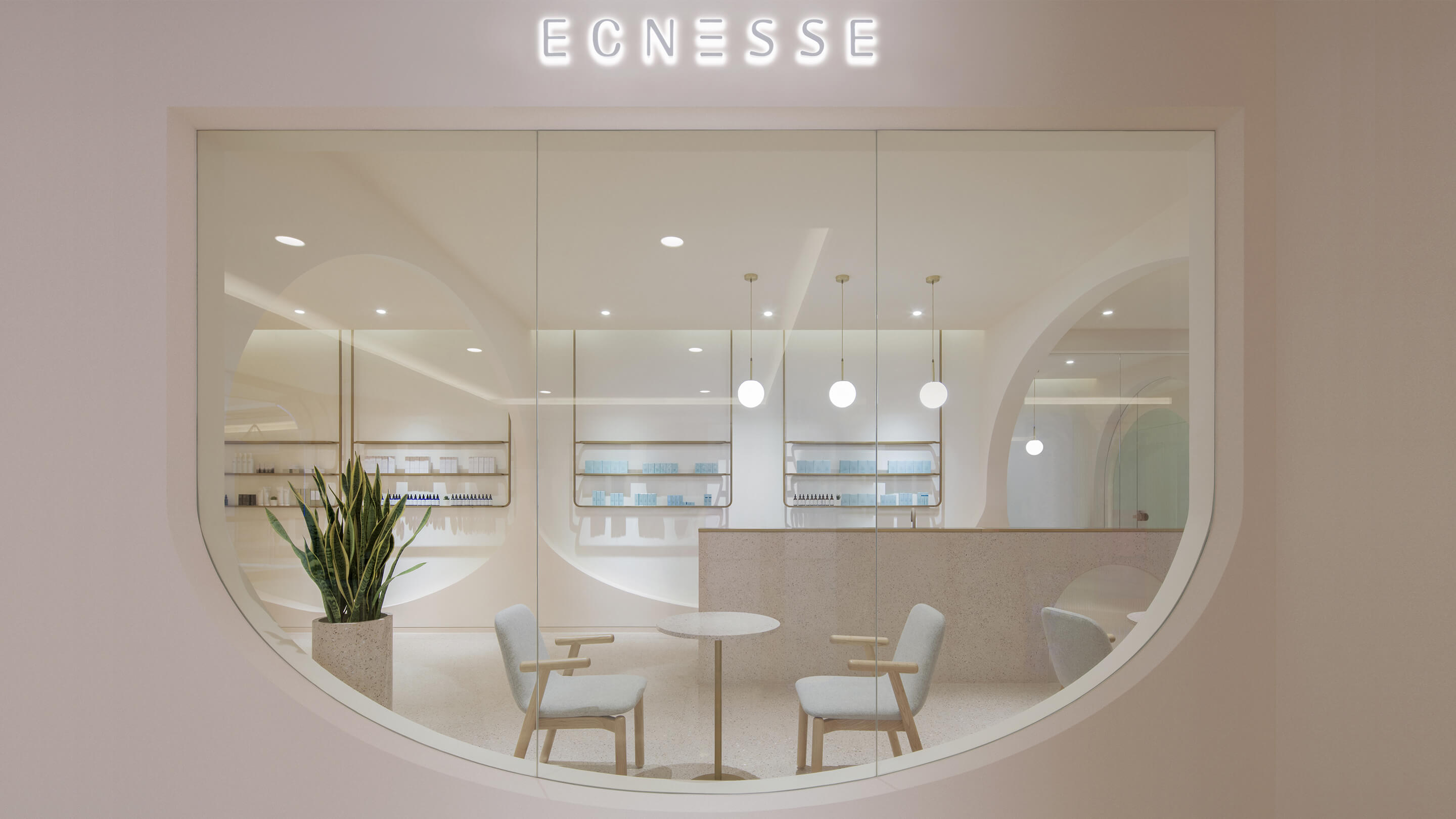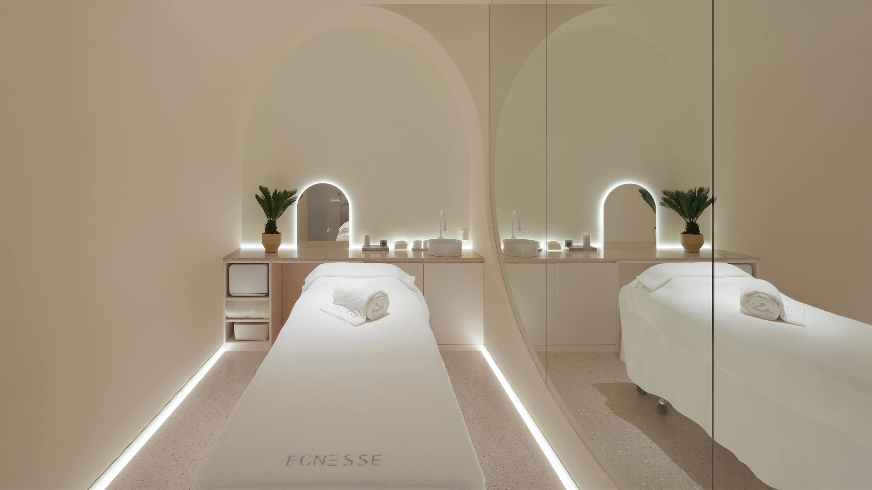 其次,对空间形态进行抽象提炼,创造品牌标识。美容的空间是非常私密的,传统的空间顾客躺下来看到的只能是单调的方盒子和天花板,升级方案从洞穴中获得灵感,希望空间是一条连续的弧线,每个独立的空间都是一个独立的洞穴,让顾客在享受美容服务同时也能享受空间带来的独特感受。