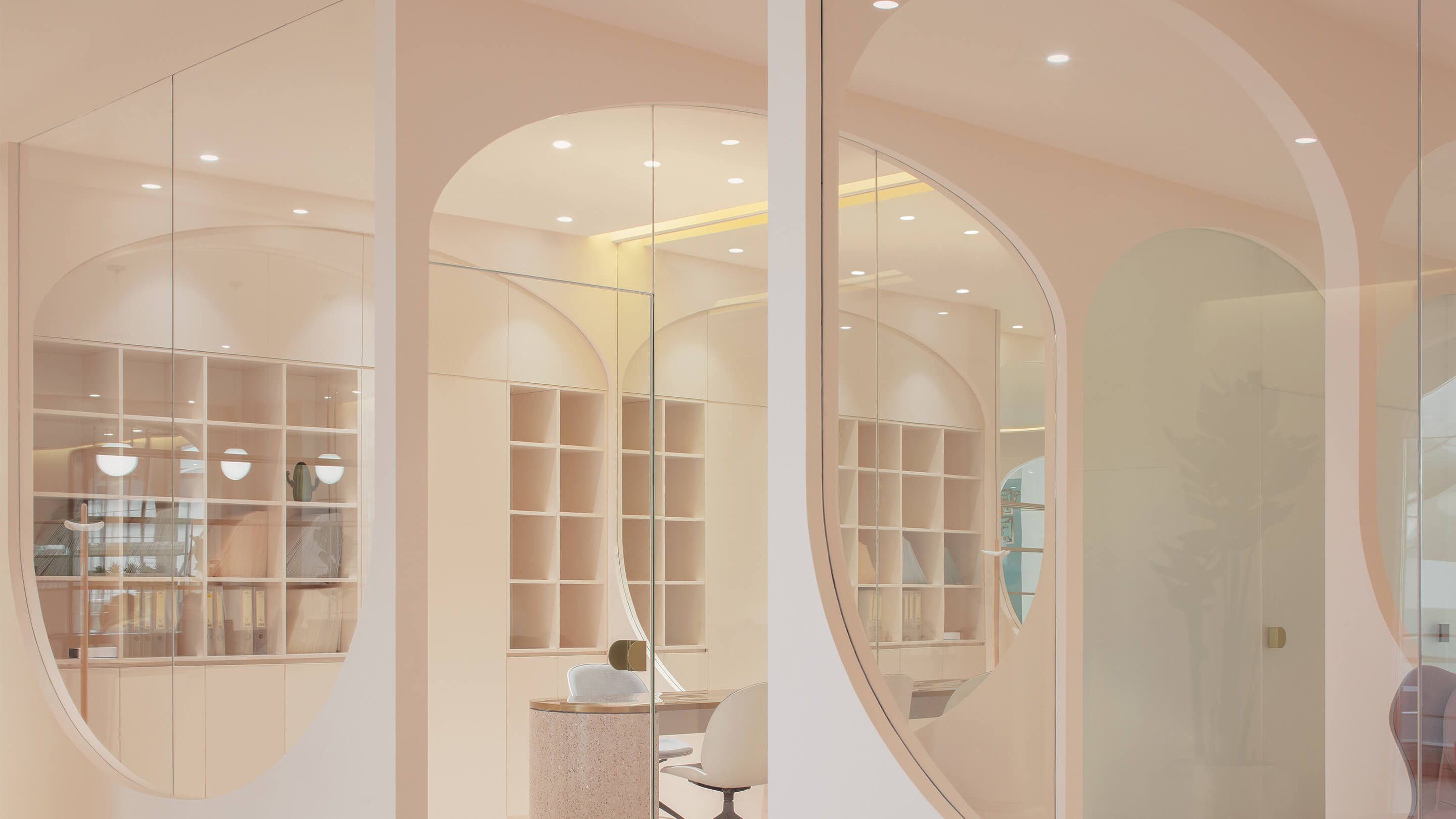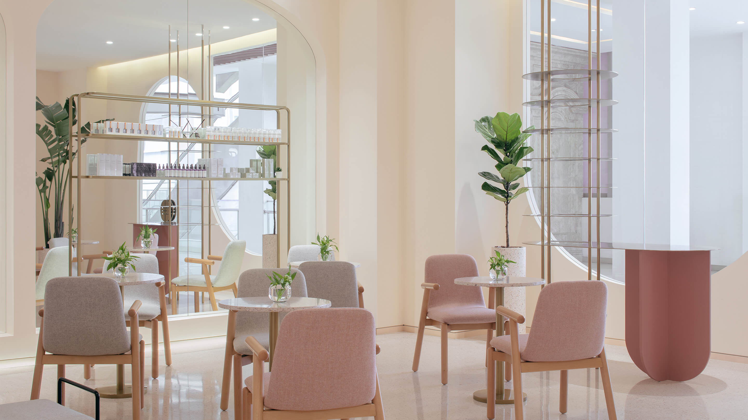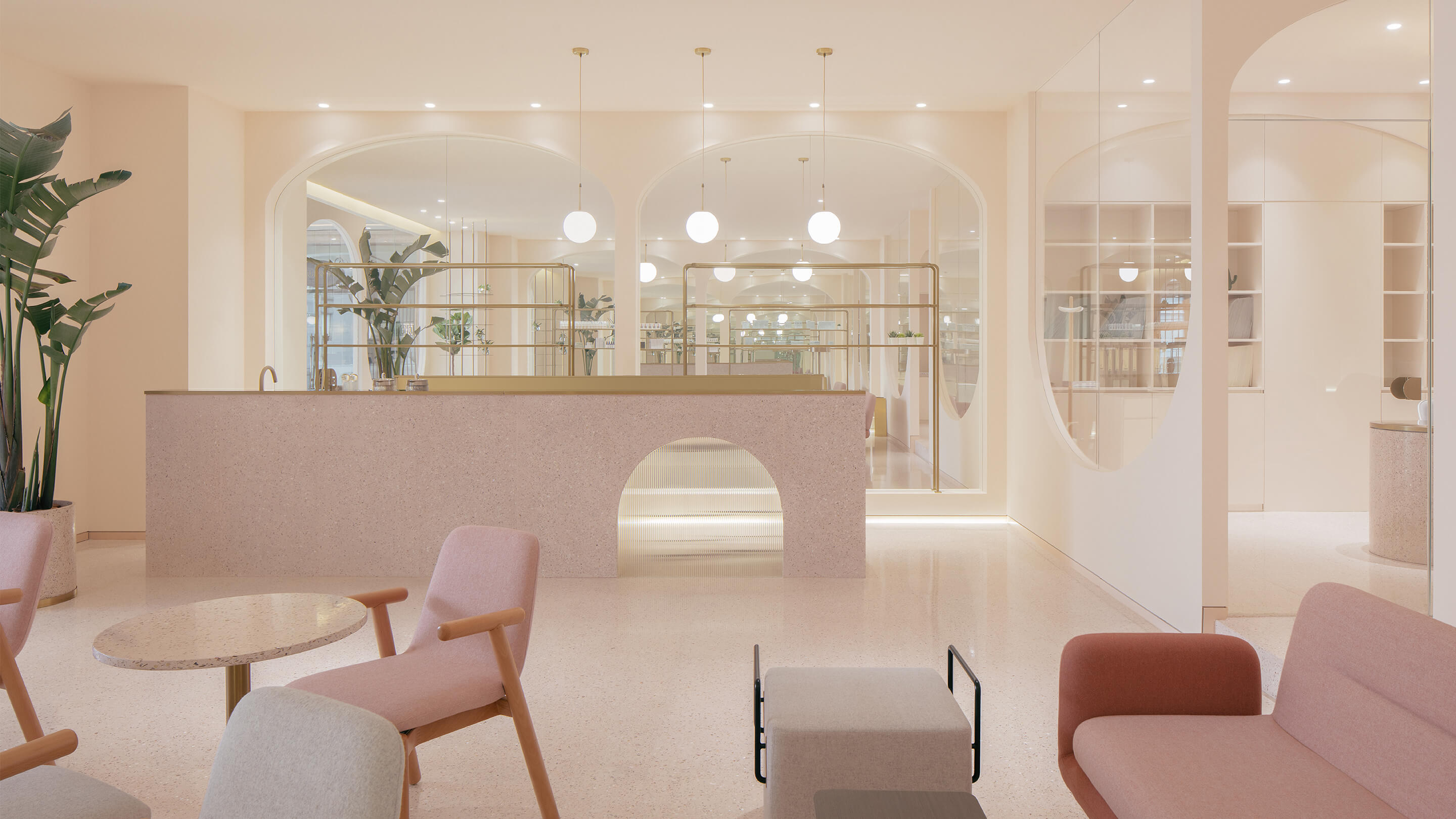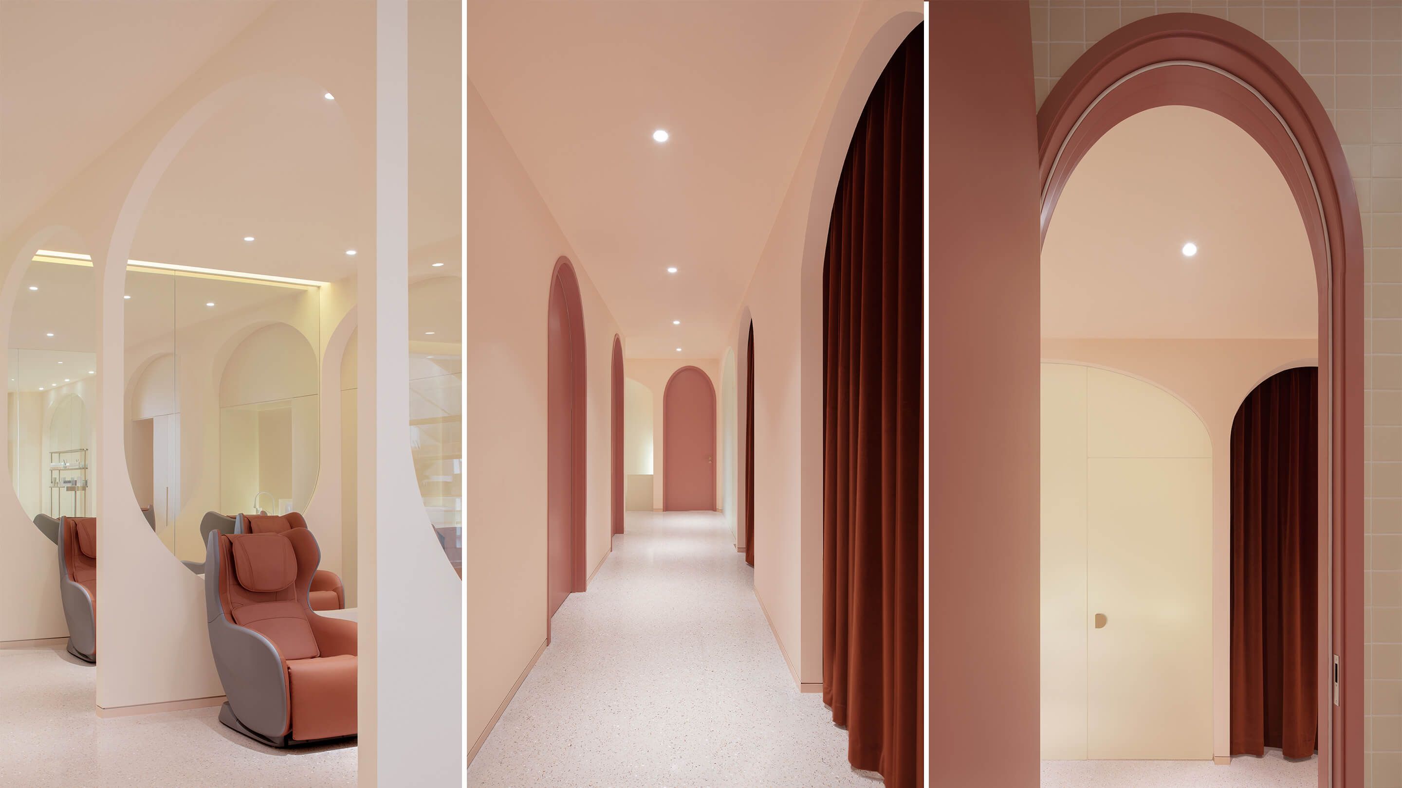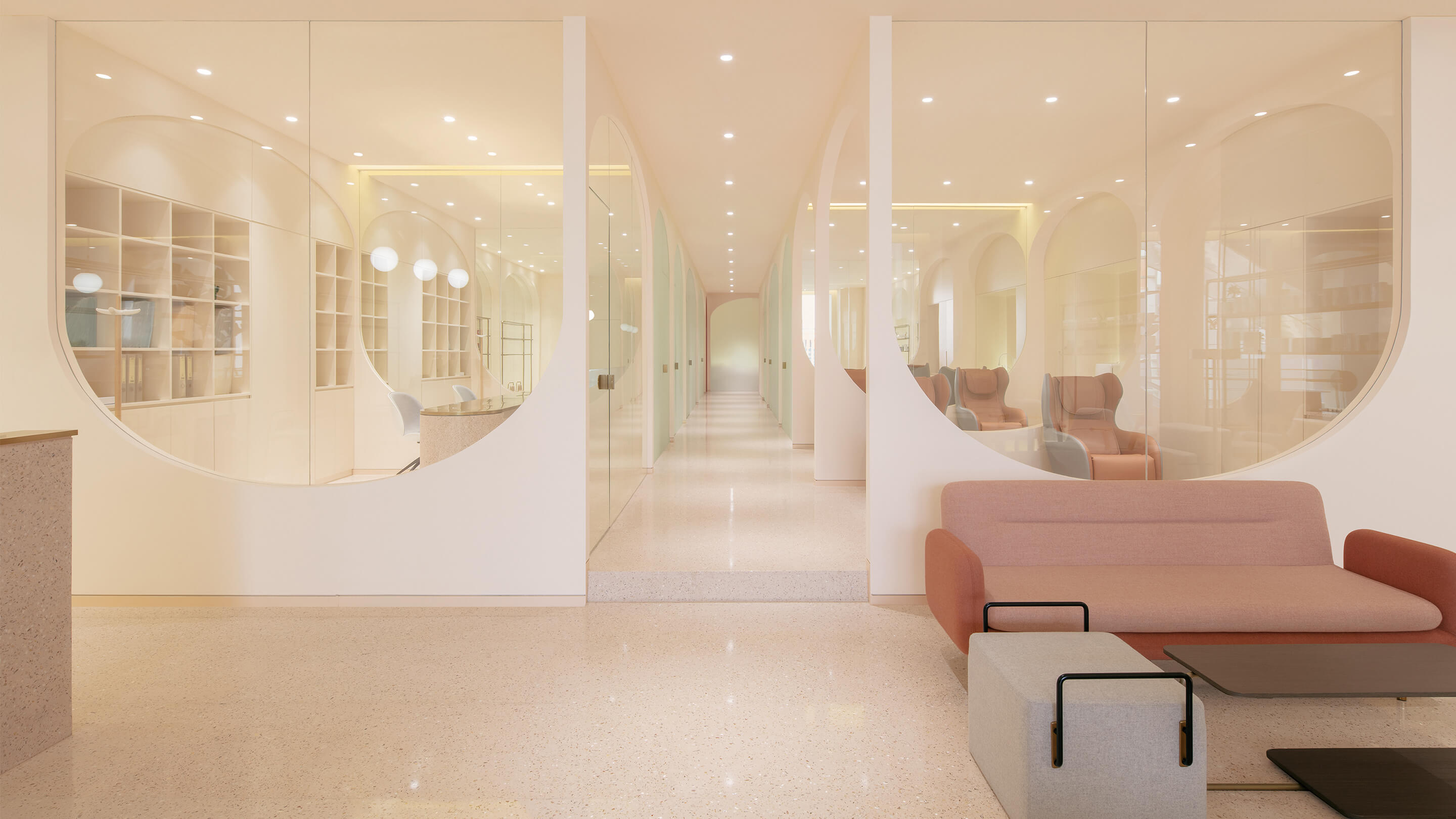 第三是对空间色彩的调整,美容行业是一个非常女性化行业,水仙的主要顾客人群也以女性为主,所以设计的空间选用了粉色系的色彩体系,希望打破人们对美容店单调的白色空间的传统看法,粉色的空间配合拱形的造型,拉近人与空间的距离,创造出独特的安全感和归属感。