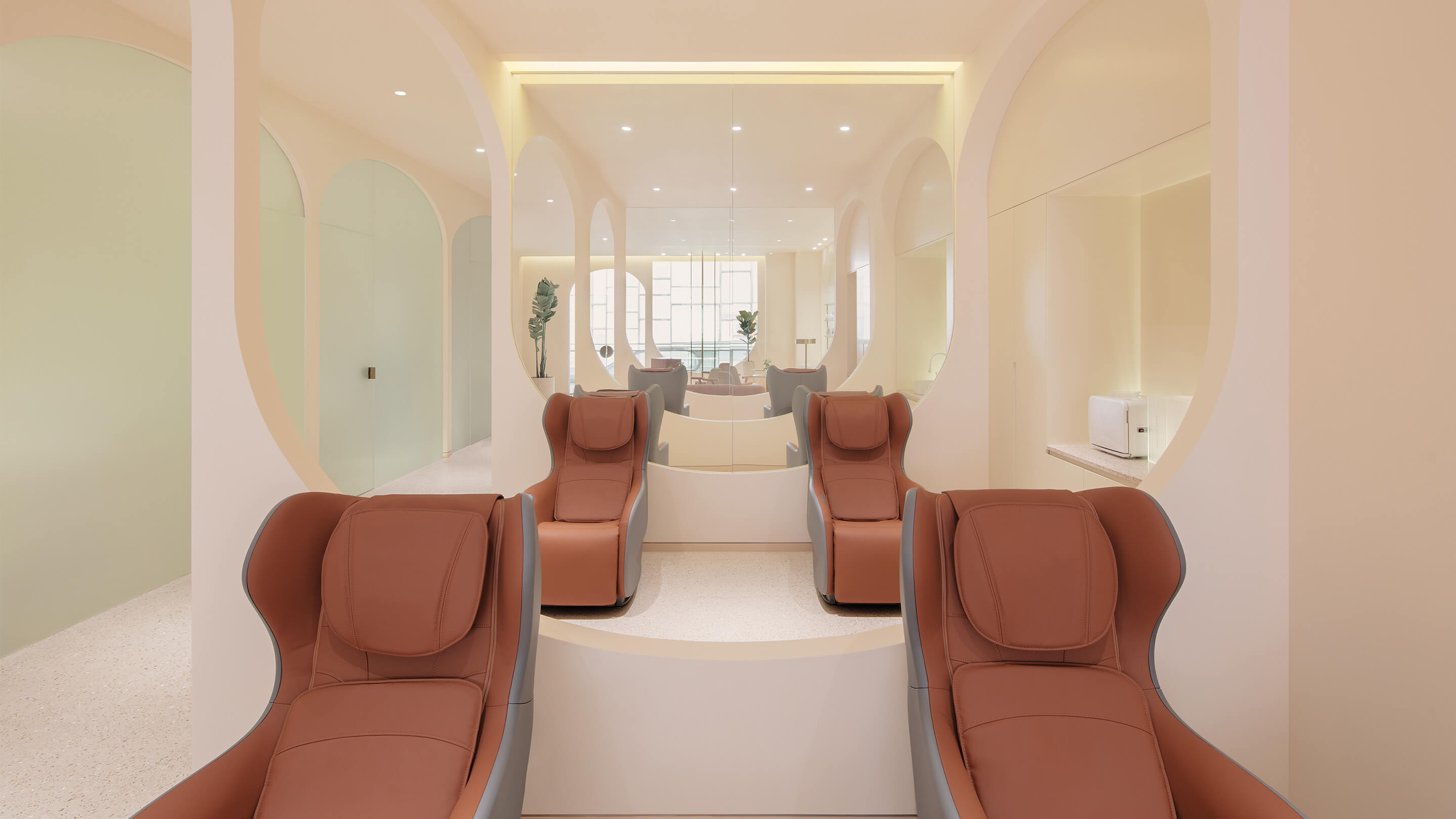 其次,对空间形态进行抽象提炼,创造品牌标识。美容的空间是非常私密的,传统的空间顾客躺下来看到的只能是单调的方盒子和天花板,升级方案从洞穴中获得灵感,希望空间是一条连续的弧线,每个独立的空间都是一个独立的洞穴,让顾客在享受美容服务同时也能享受空间带来的独特感受。