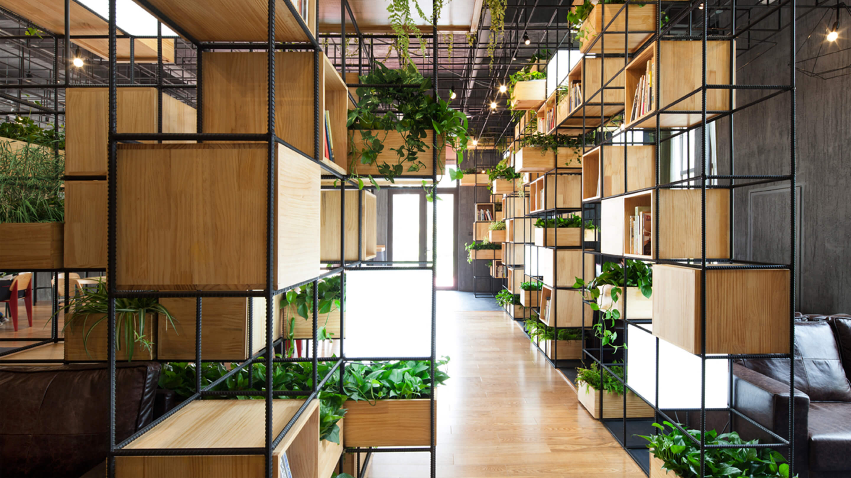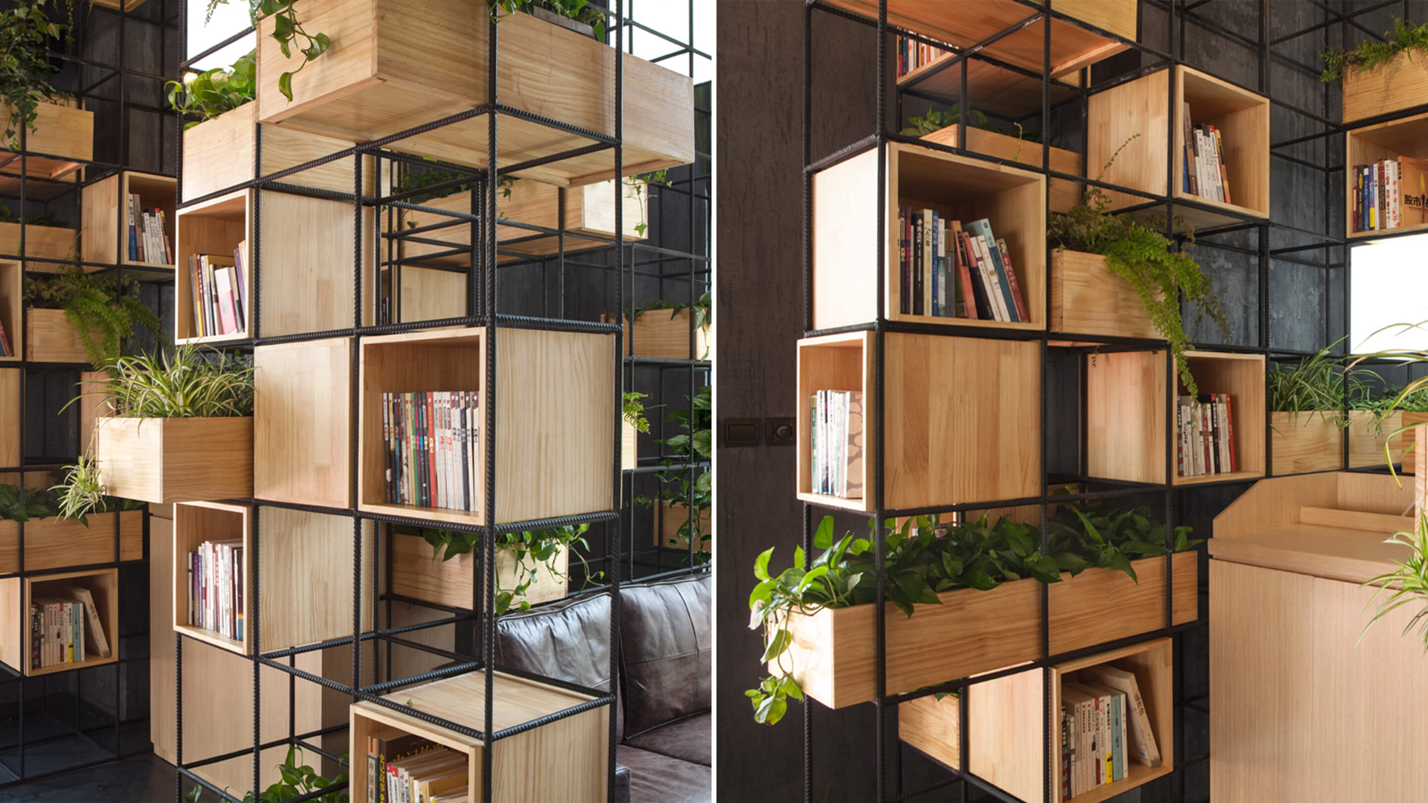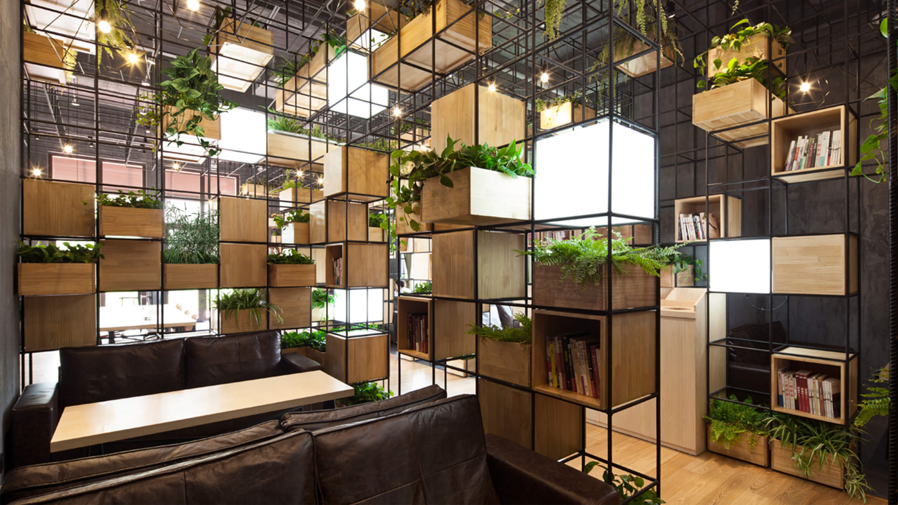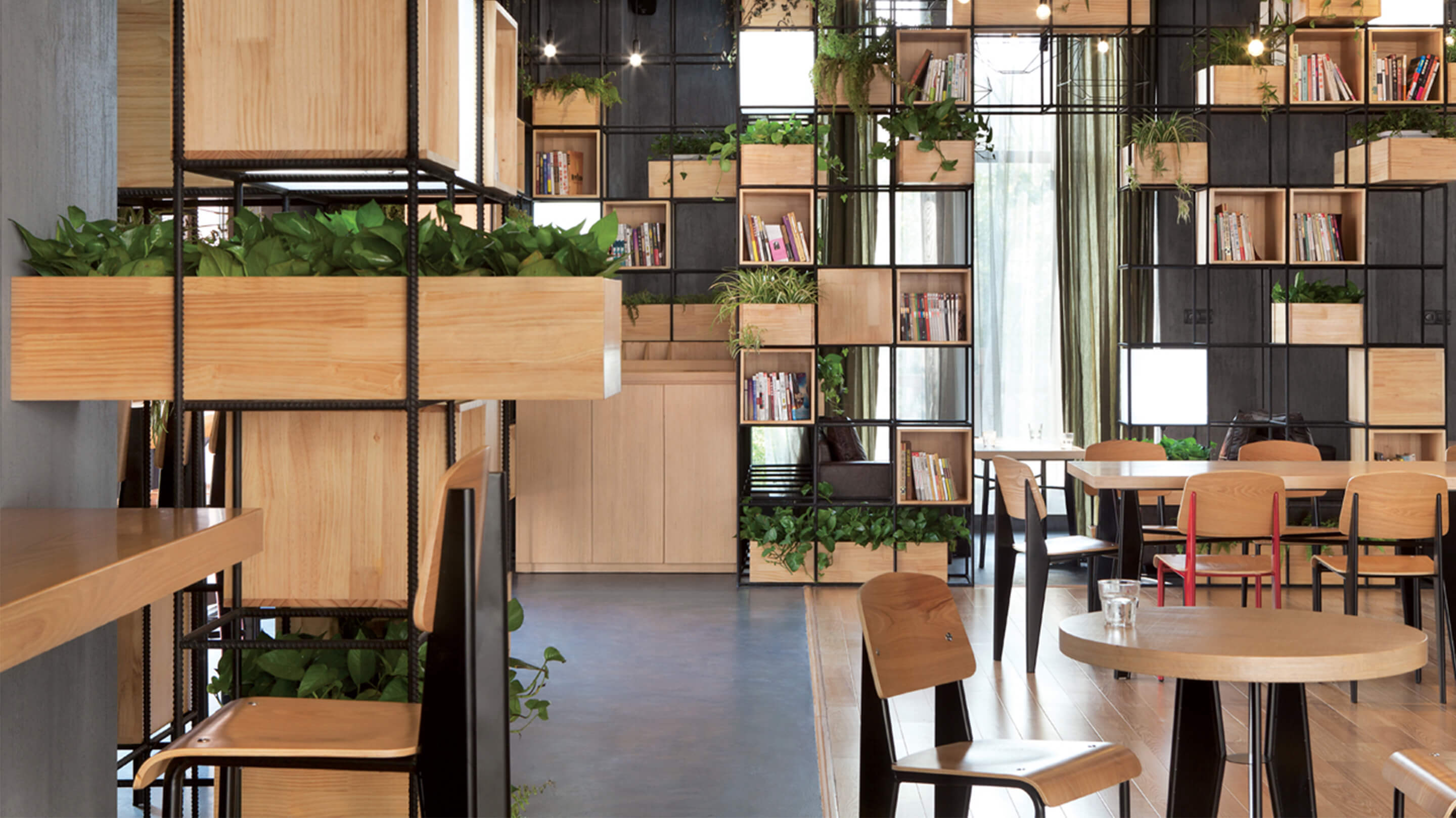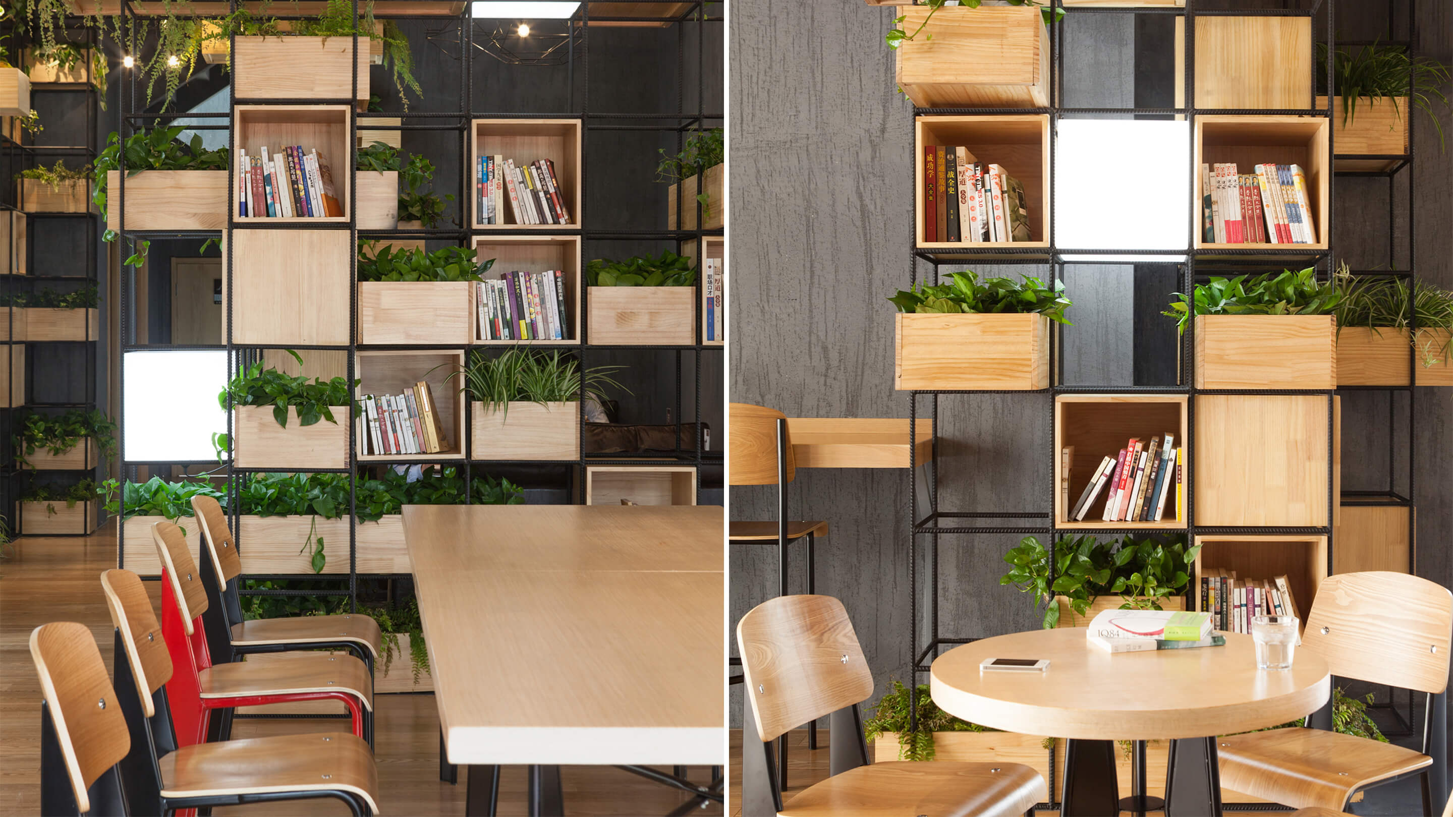 Constructed with recycled steel bars, the modular dividers shelving plants, books and lights give Home Café a hybrid of industrial and horticultural touches.