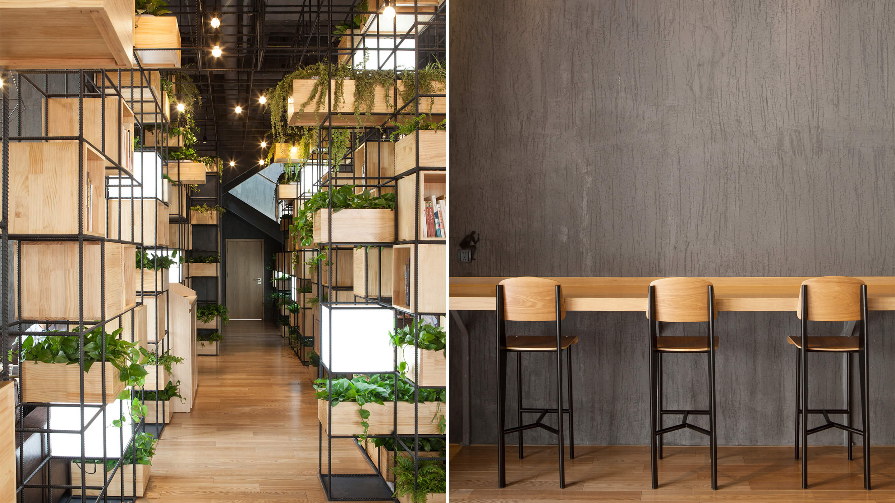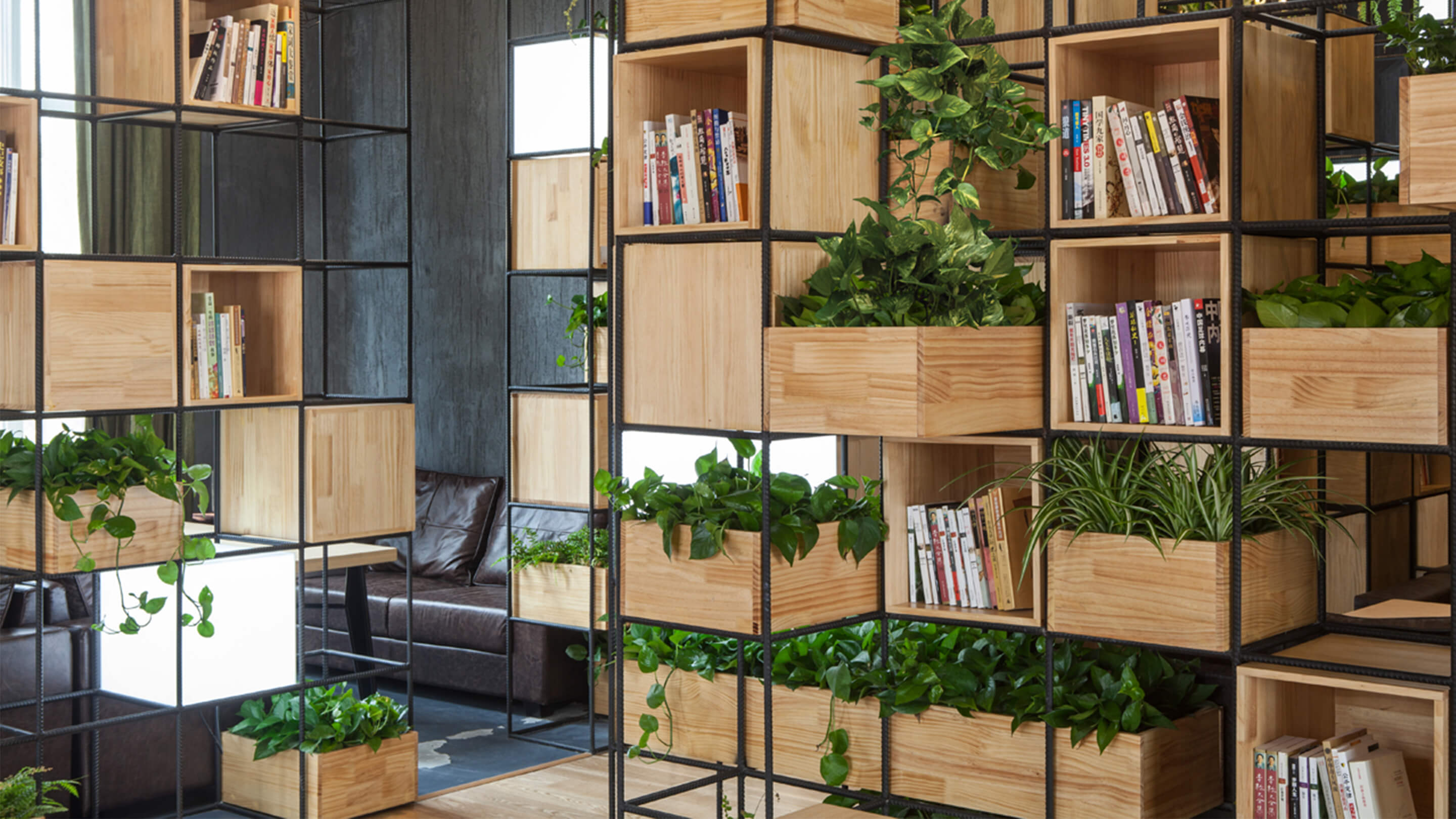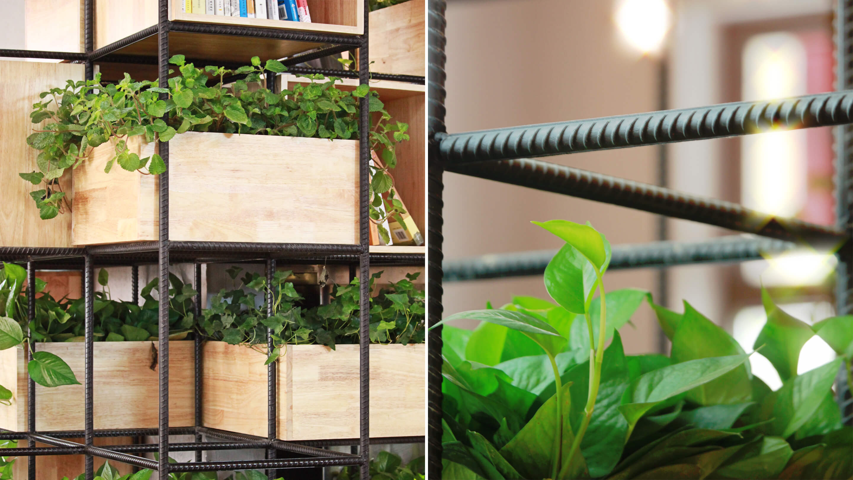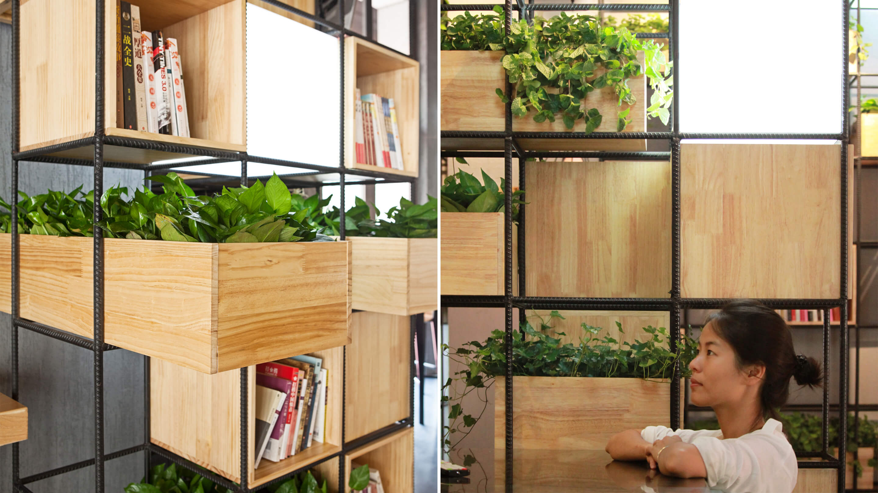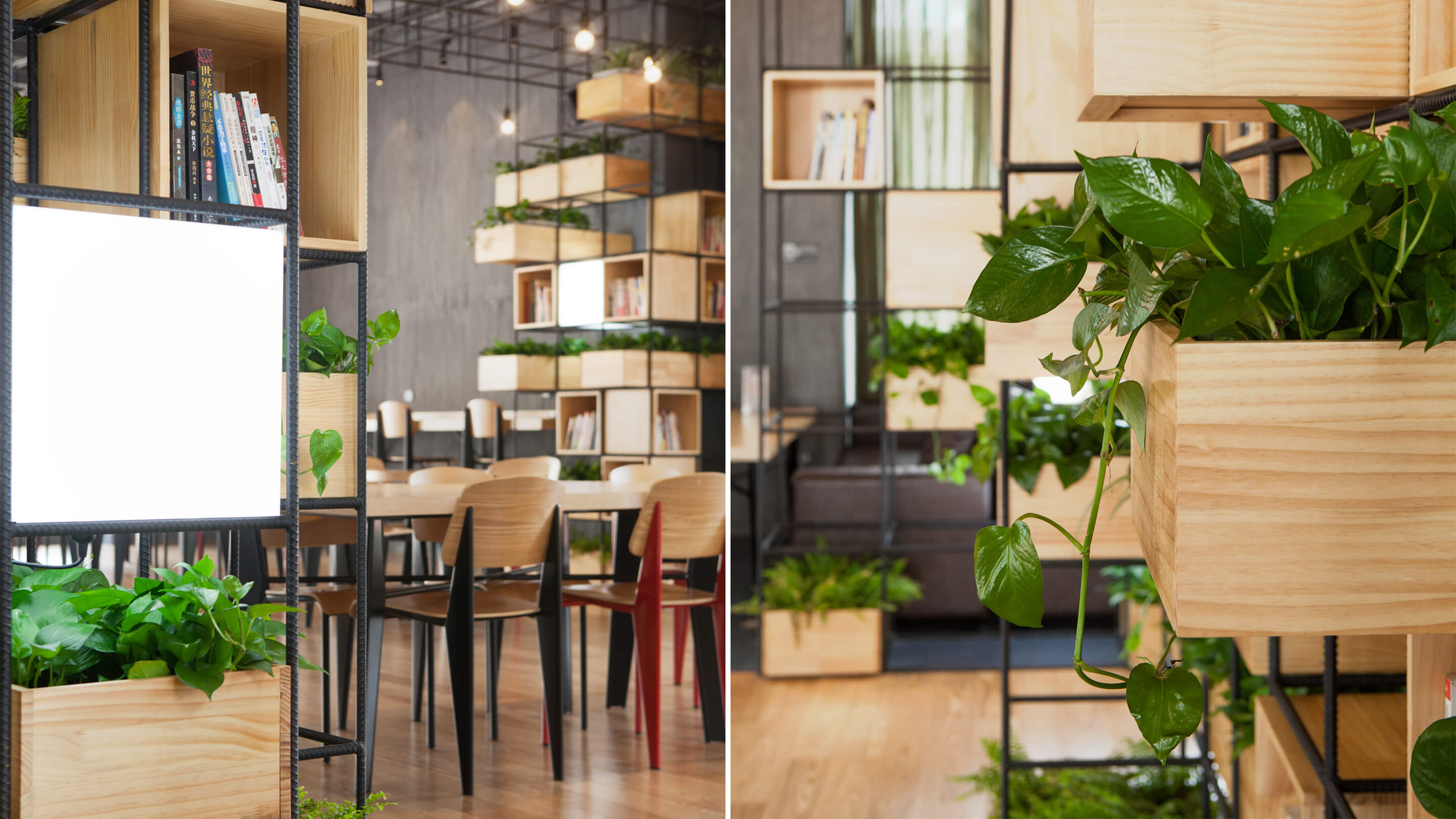 Constructed with recycled steel bars, the modular dividers shelving plants, books and lights give Home Café a hybrid of industrial and horticultural touches.