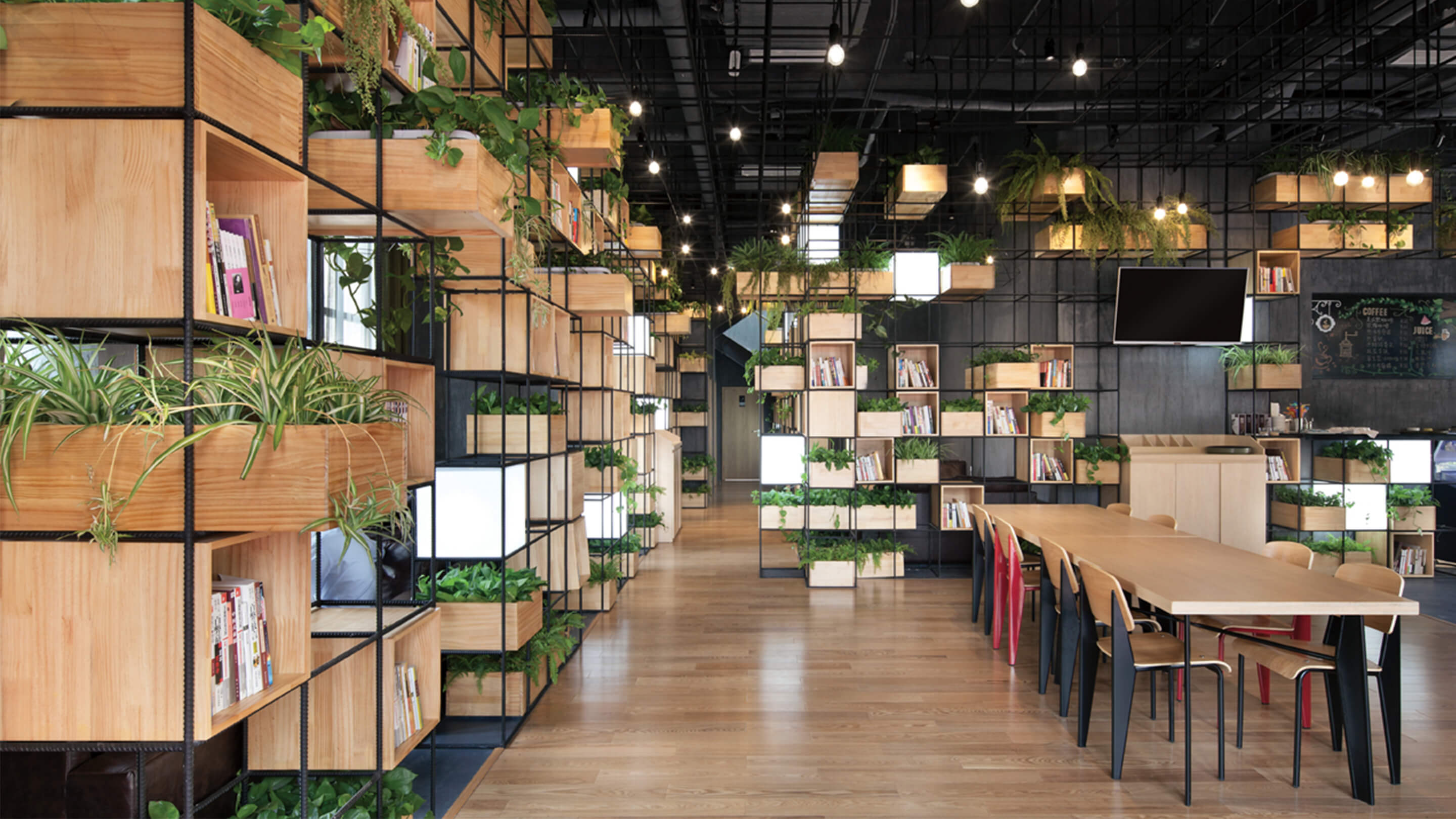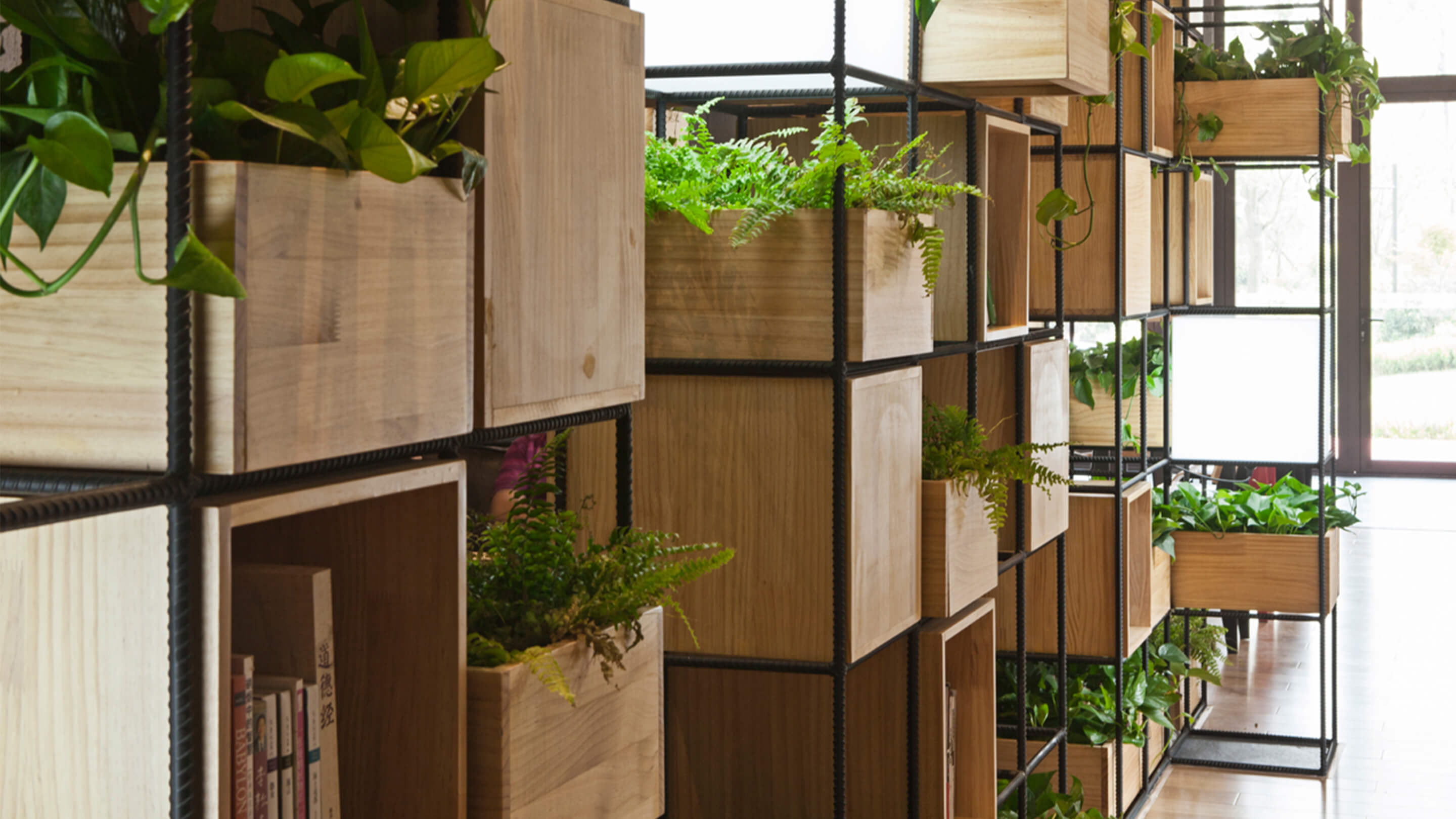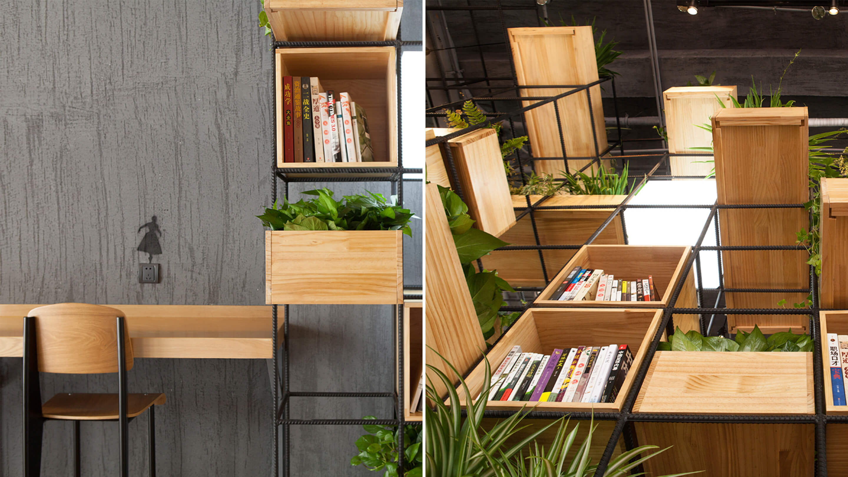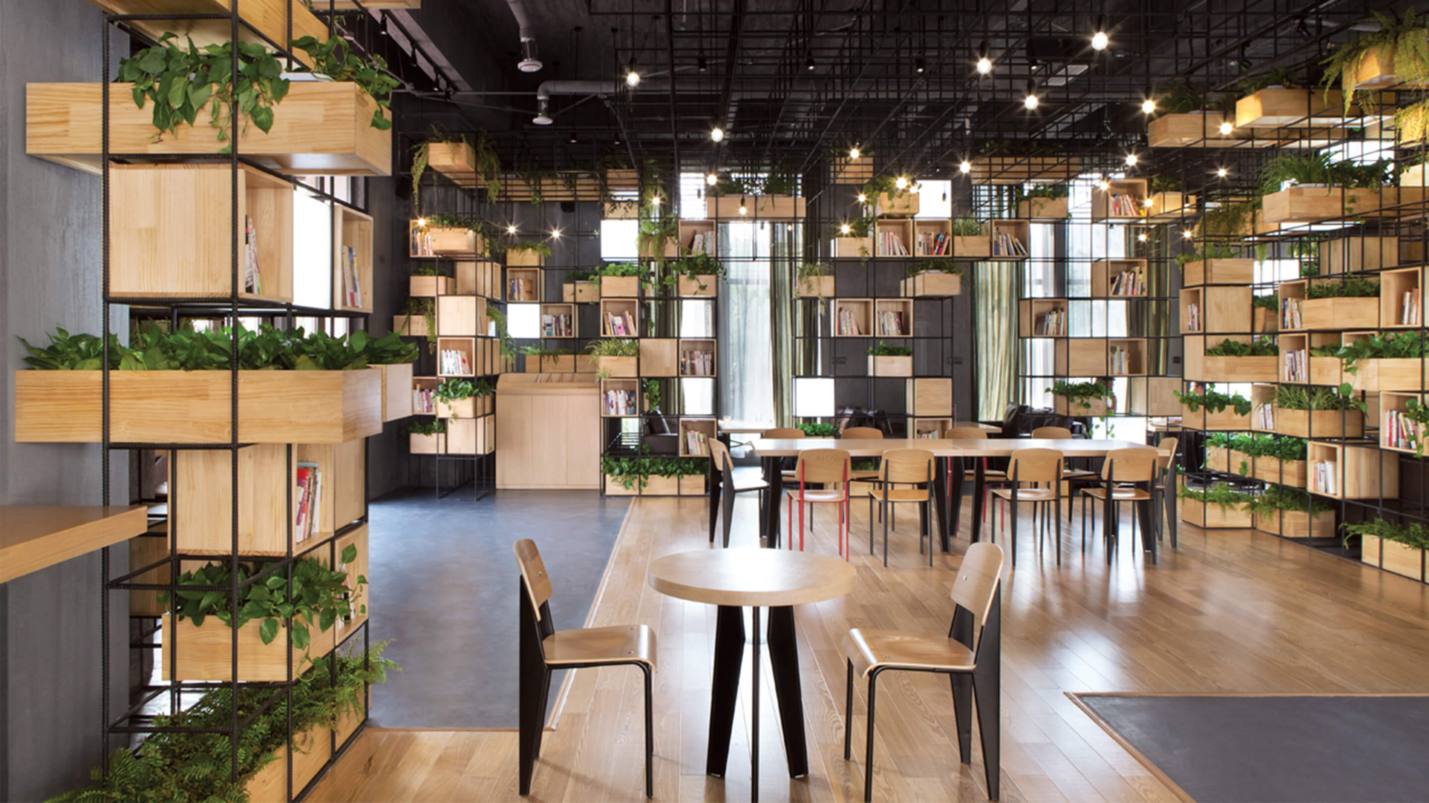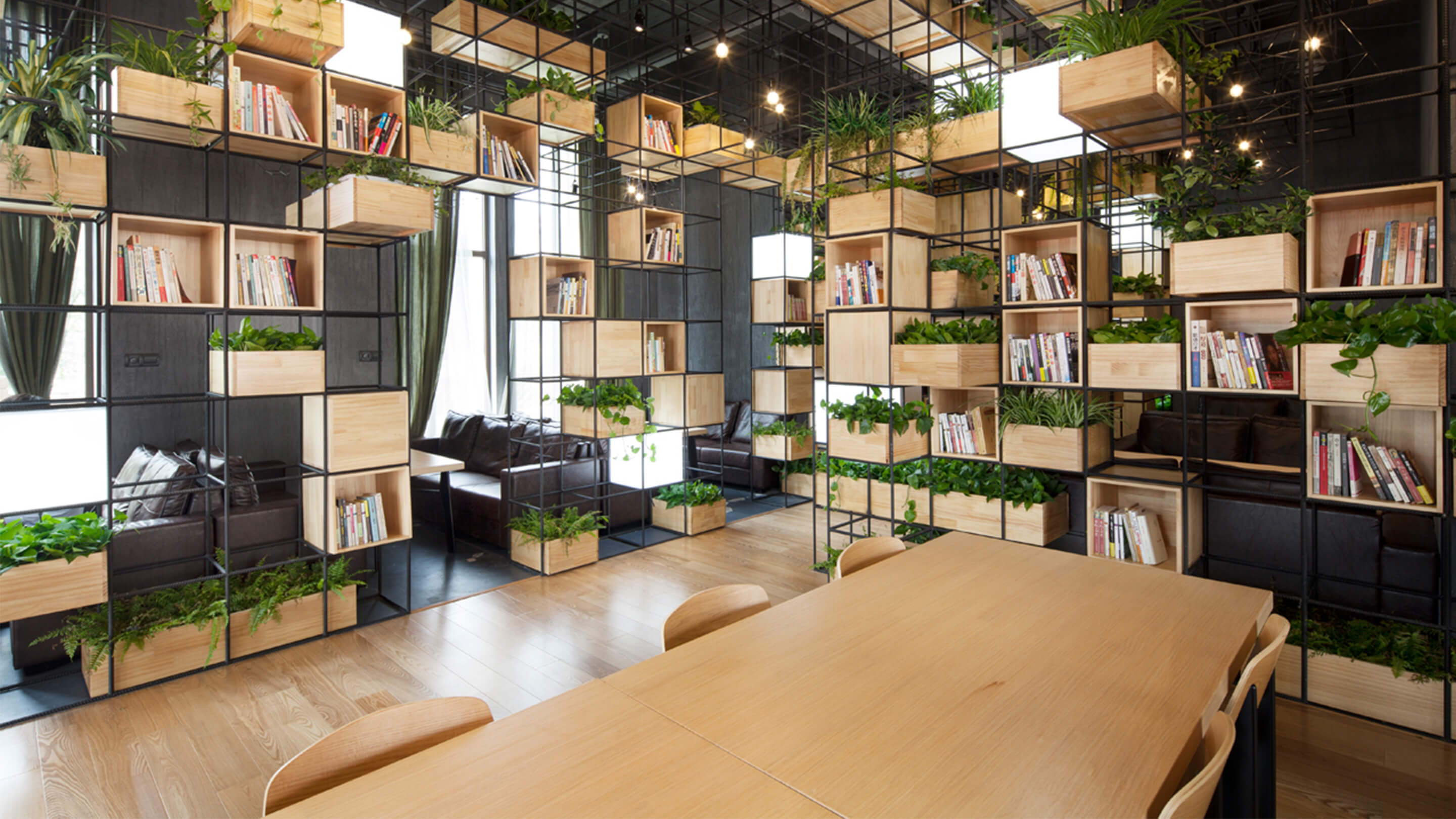 Constructed with recycled steel bars, the modular dividers shelving plants, books and lights give Home Café a hybrid of industrial and horticultural touches.