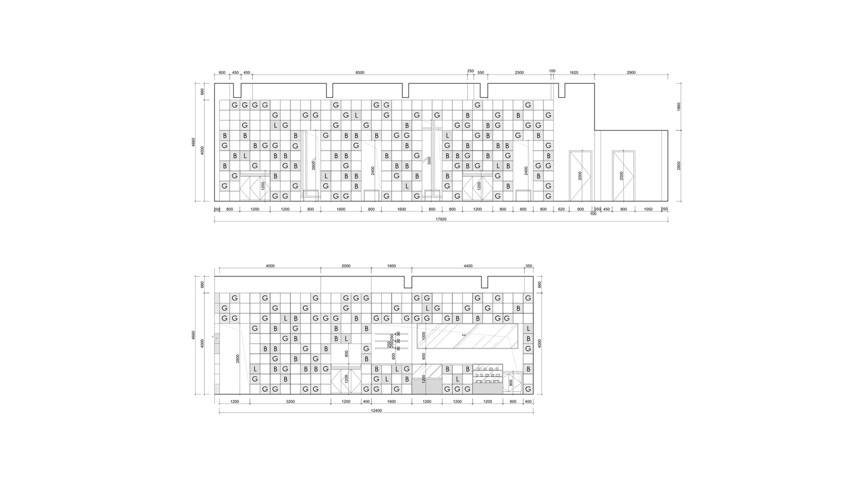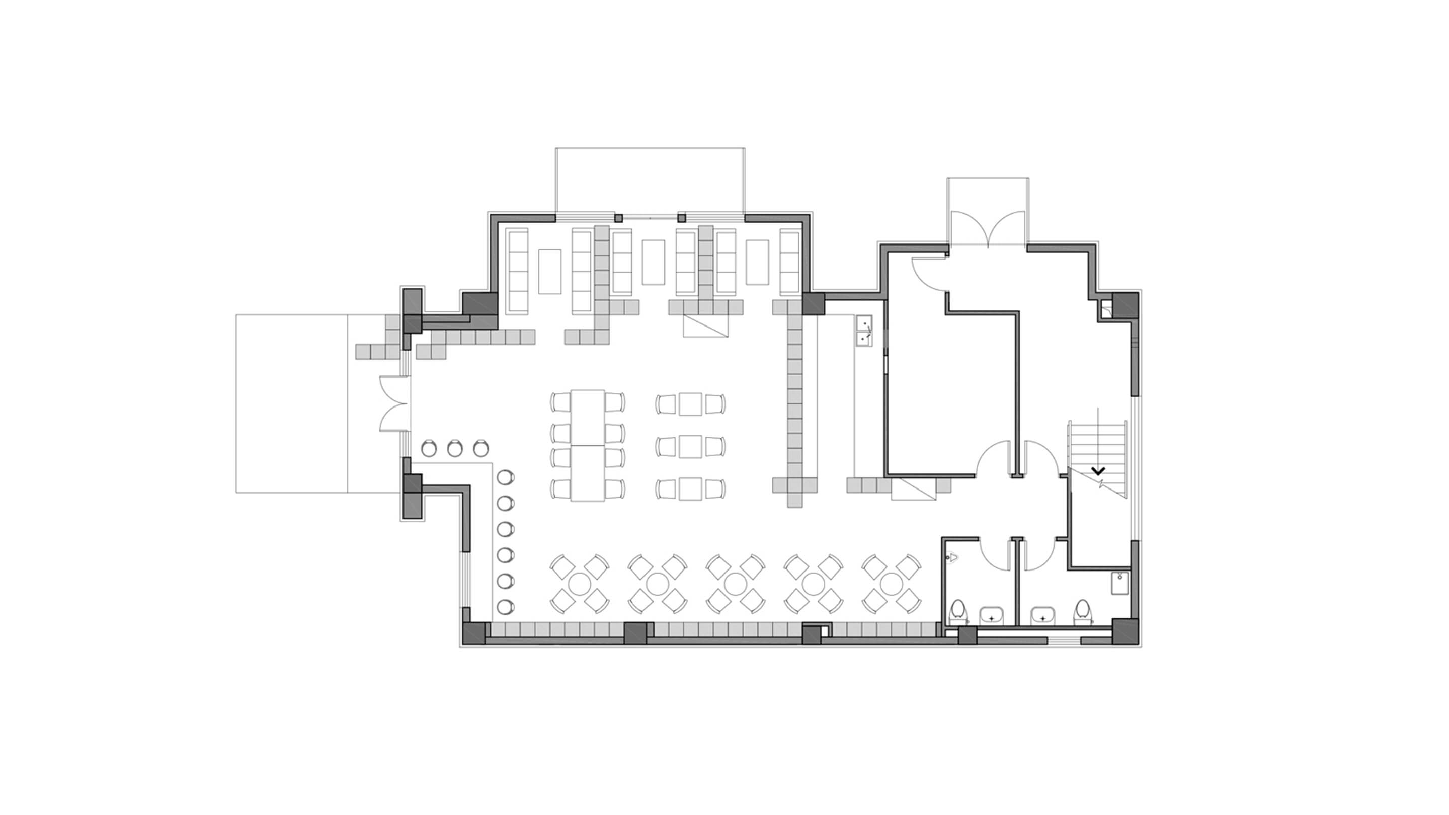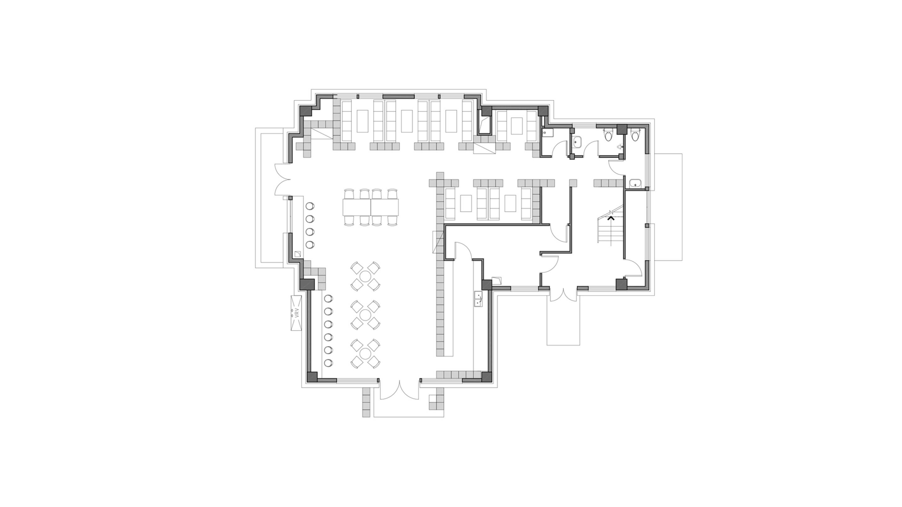 A modular grid system and its various fillings offer flexible reconfiguration for the café.