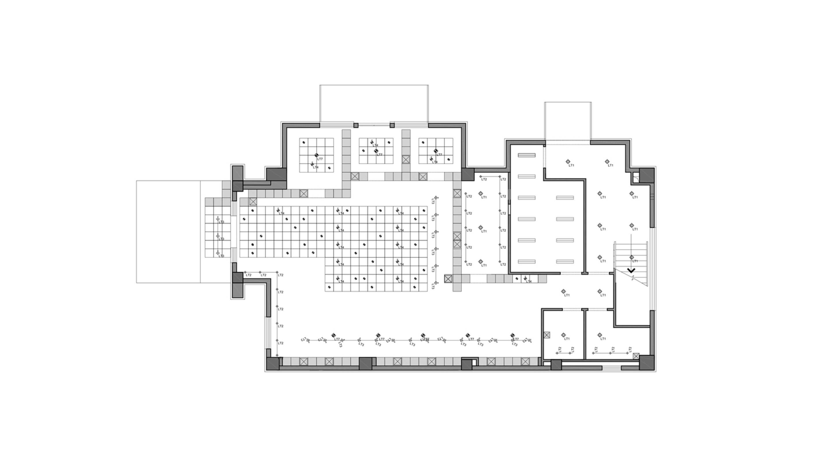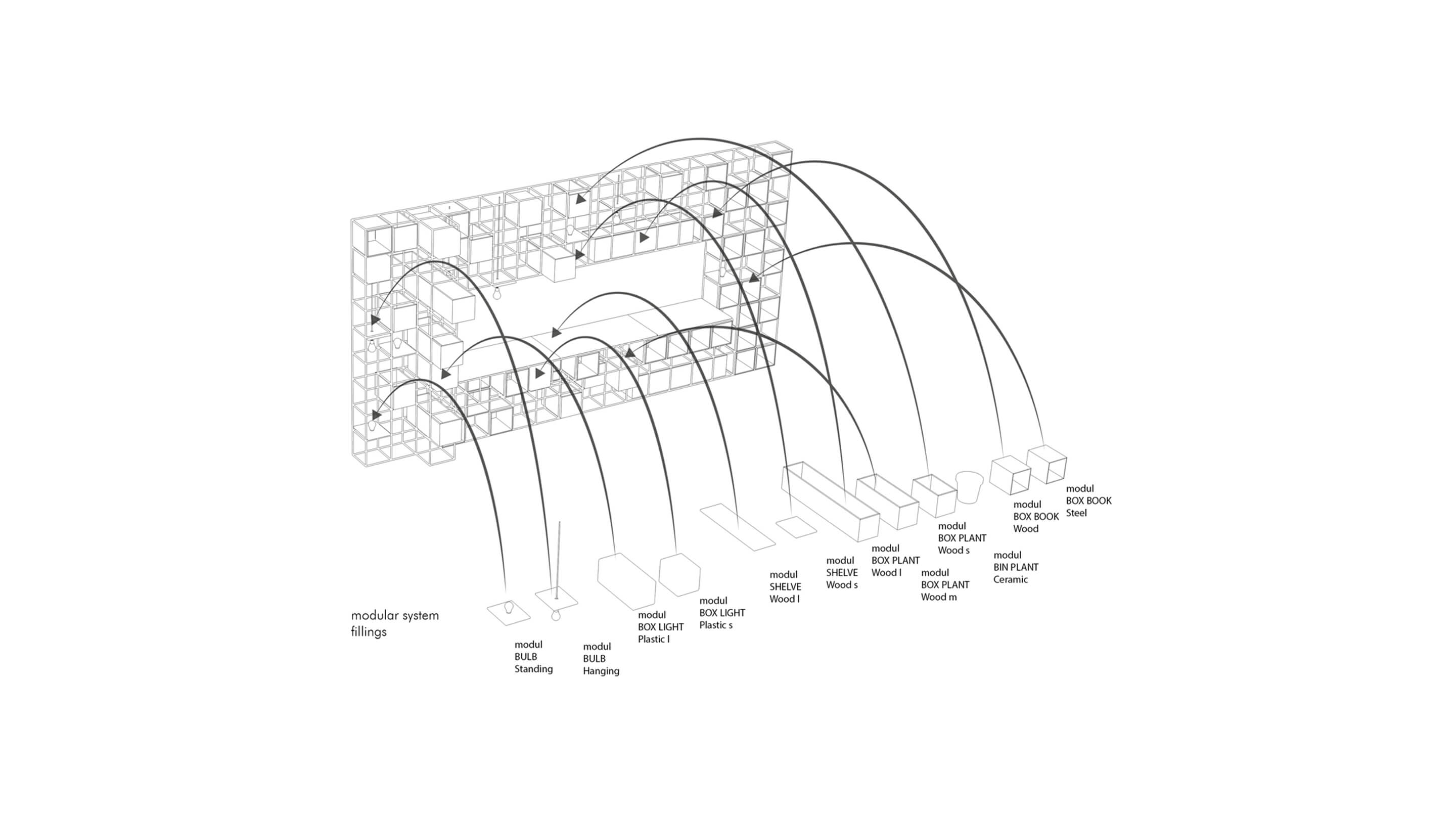 The structural grid offers a space, where various cubic elements can be implemented. Boxes of plants, books, and lights on different levels create various densities for the interior. By organizing the cubes, the modular system allows a flexible assembly for different occasions.