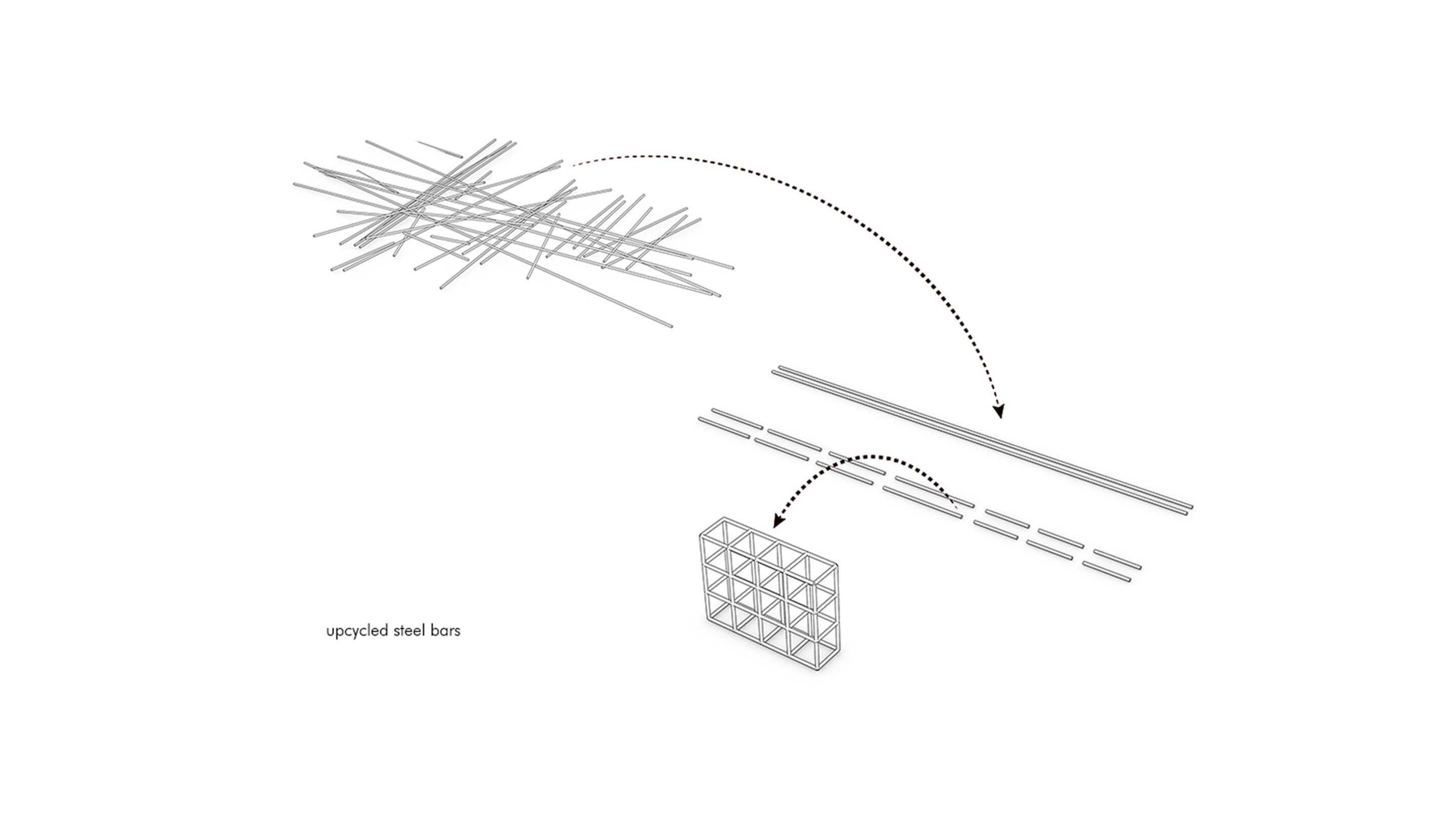 Steel bars are upcycled to become a main interior design feature. Commonly hidden within a building’s structure, steel bars are brought to light as a main design feature in Home Cafés. The reused steel bars are painted black, connected with each other and constructed as a grid that defines the appearance of the cafés.