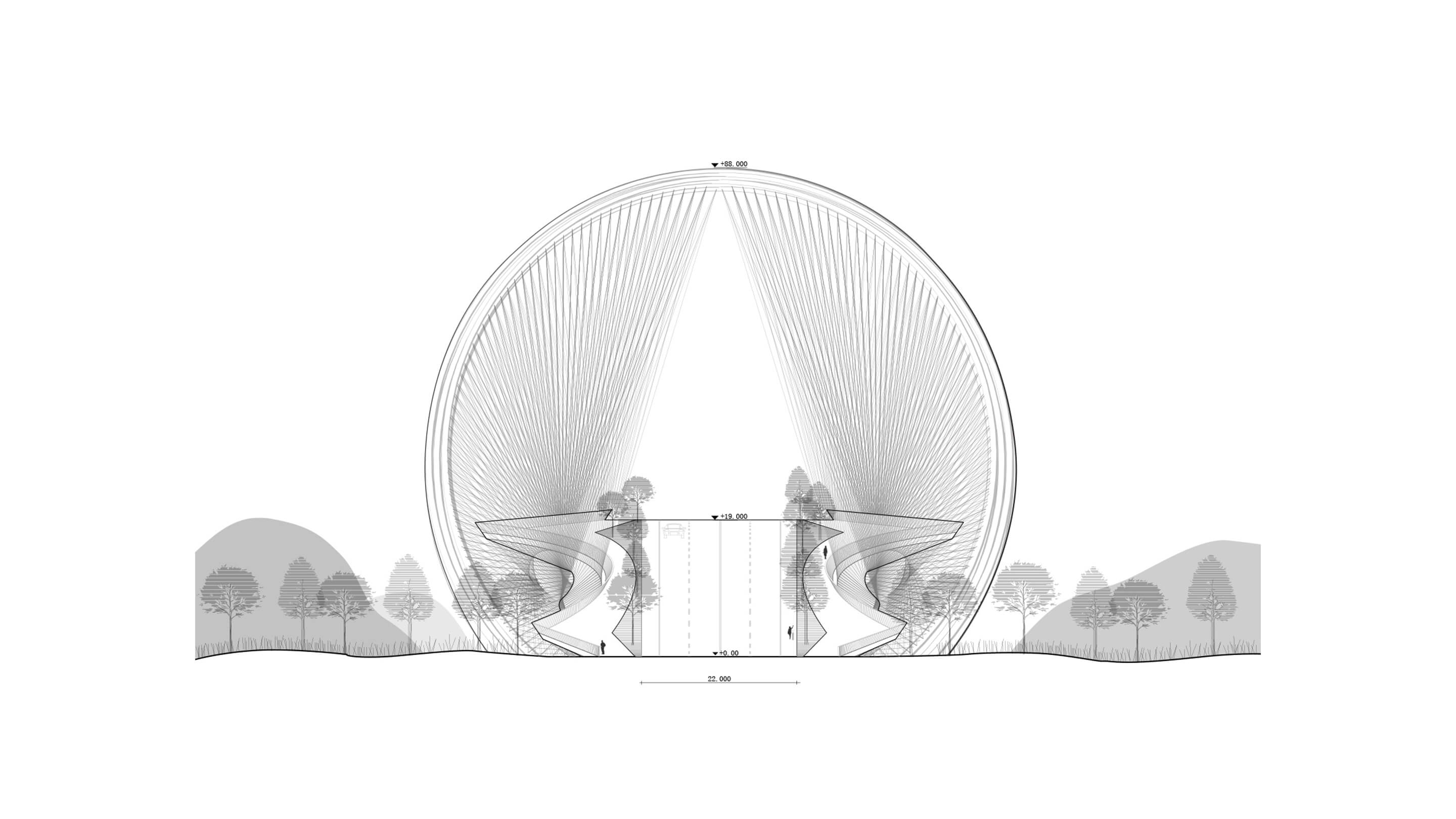 From its side, the bridge is seen as a sequence of mountains and valleys and is in an harmonious dialog with its neighbouring green hillsides, blurring the manmade structure with the natural surrounding. Seen from the top, the bridge connects the two shores of Gui River through a DNA string-like dual helix. Visitors of the Olympic Games, who are approaching the river are introduced to a multifaceted icon that changes its appearance based on ones perspective towards the bridge.