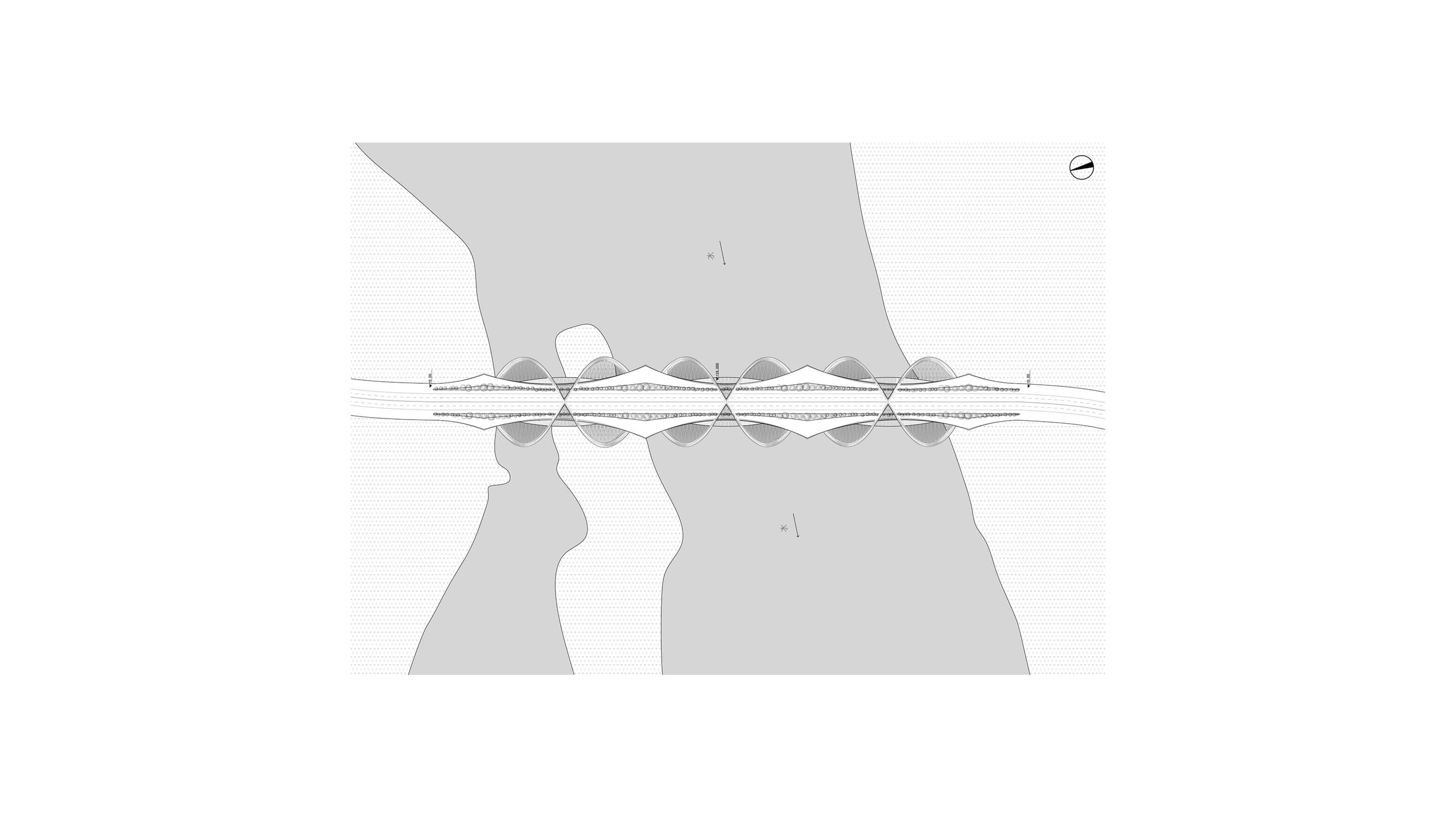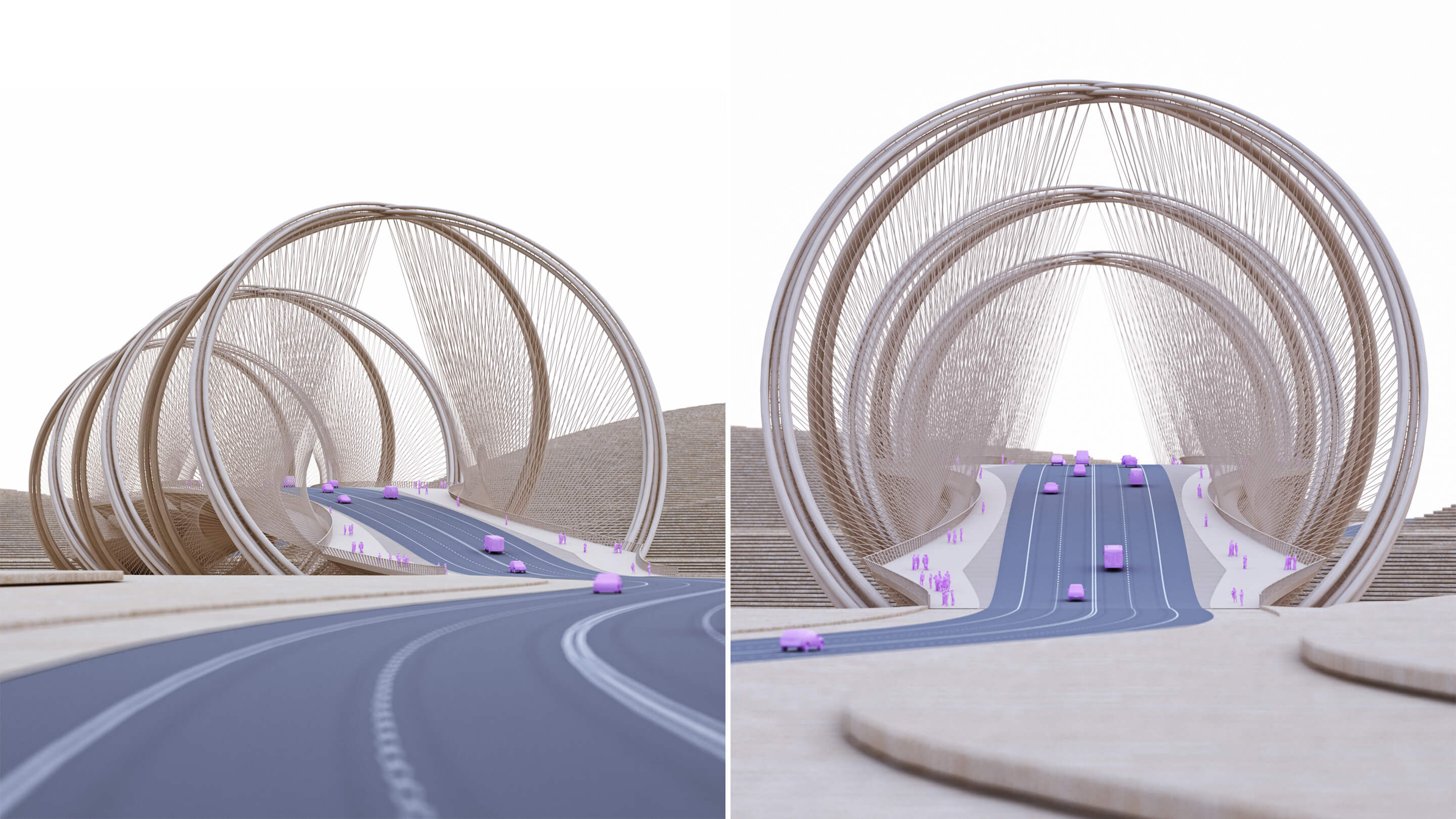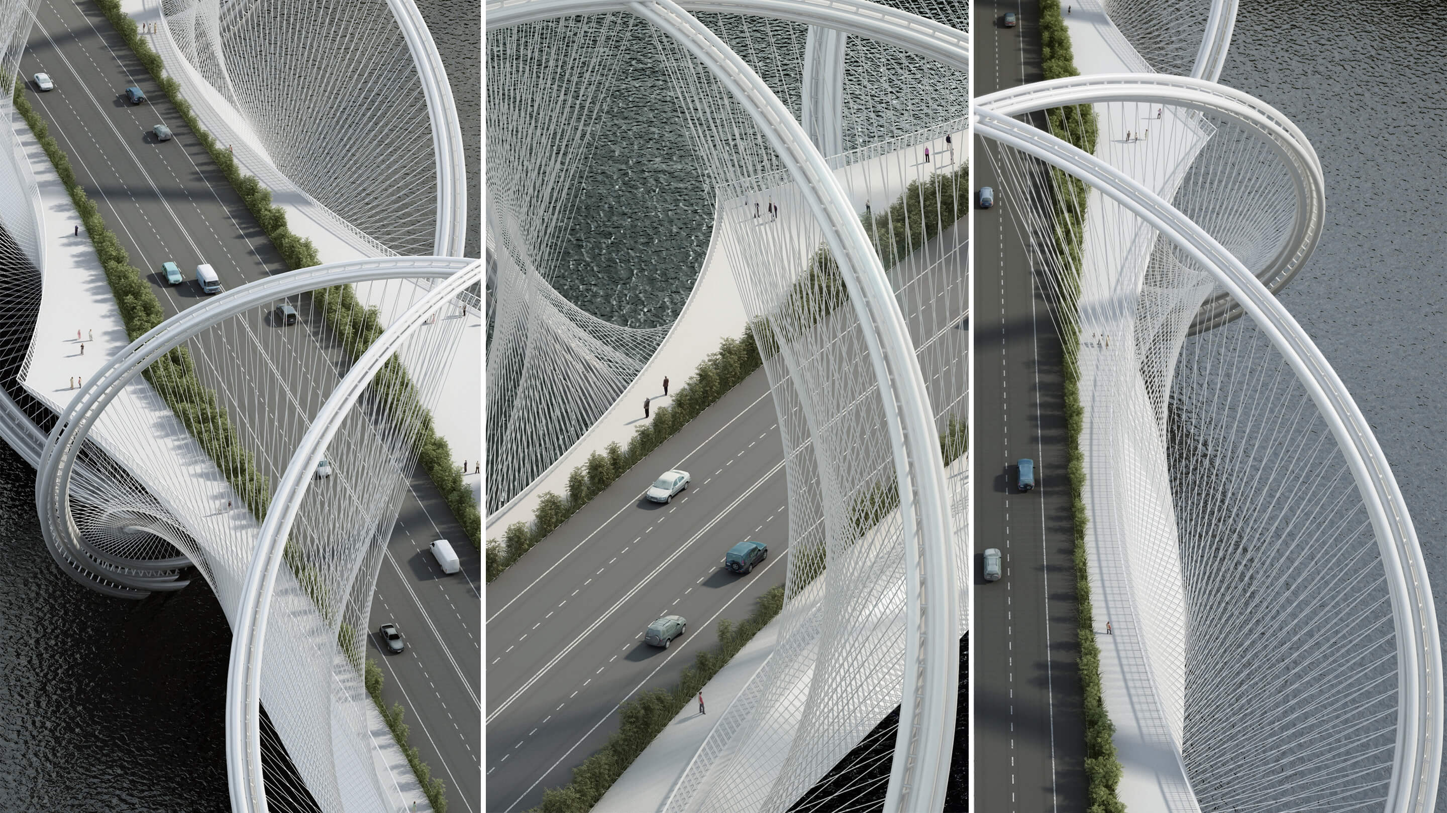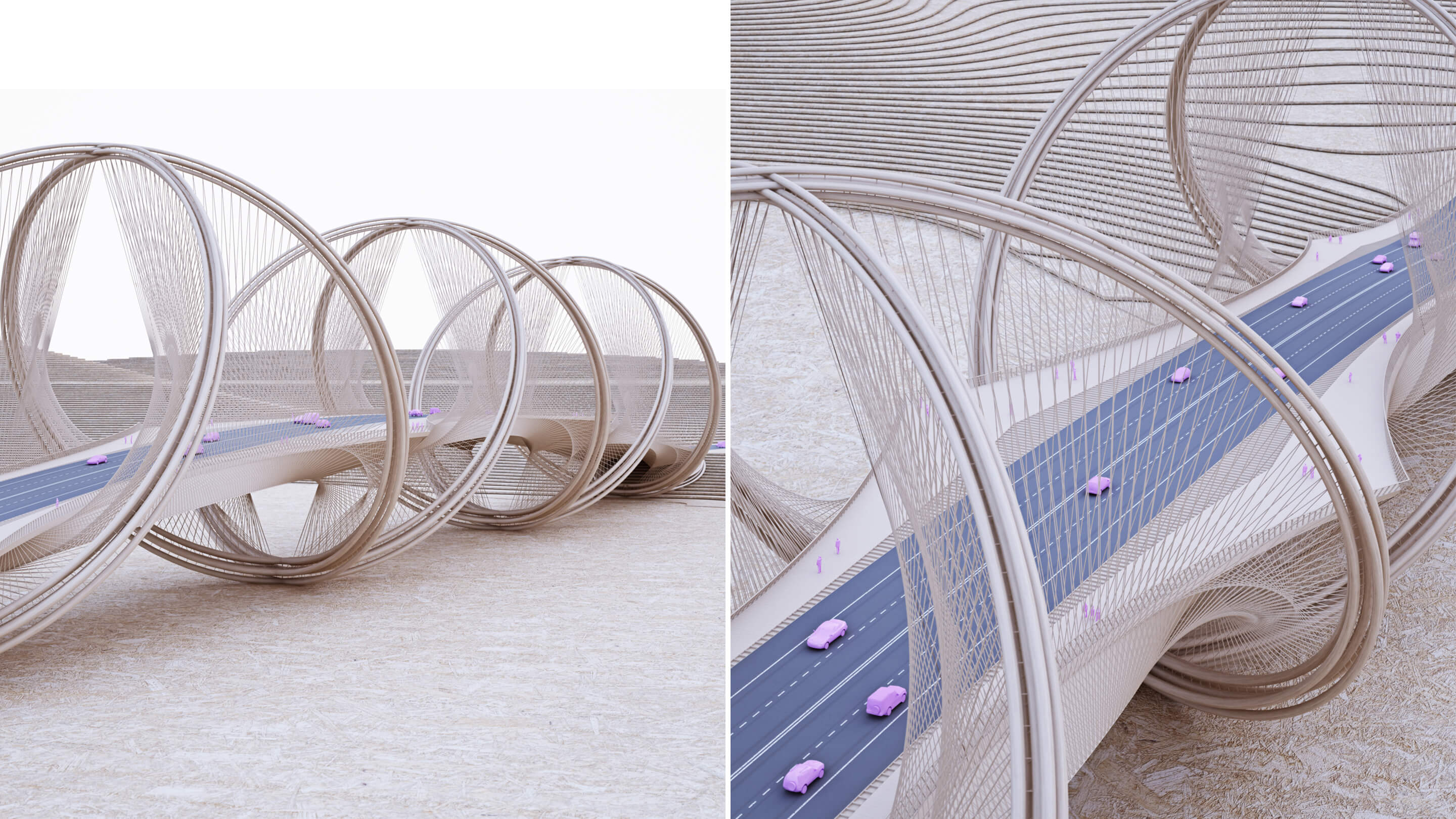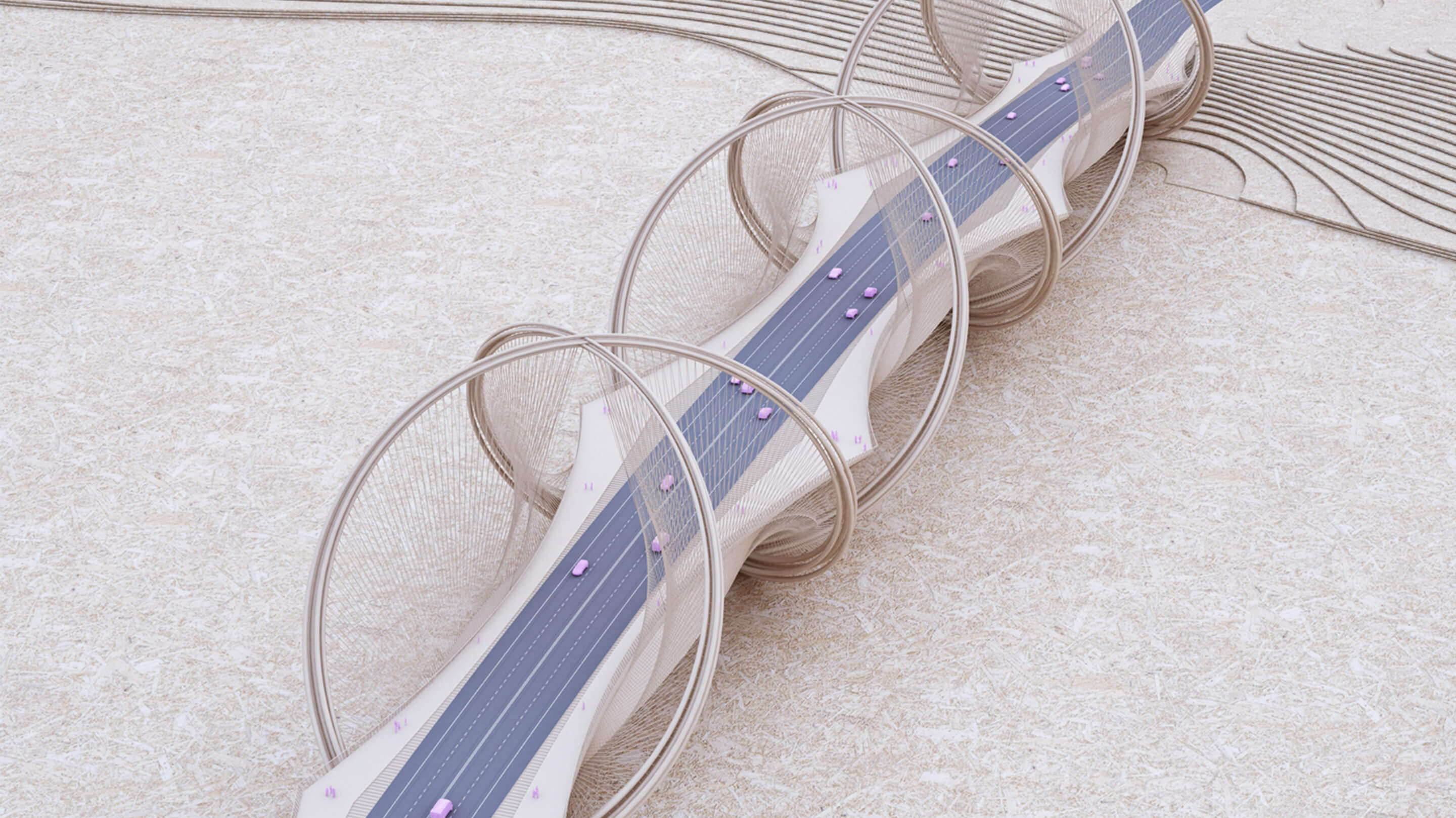 The longitudinal stiffness of the bridge is largely enhanced by the cross-connected nature of the cables to resist the dynamic load of the vehicles. The undulated surface formed by the cables define and enclose the interior space of the bridge.