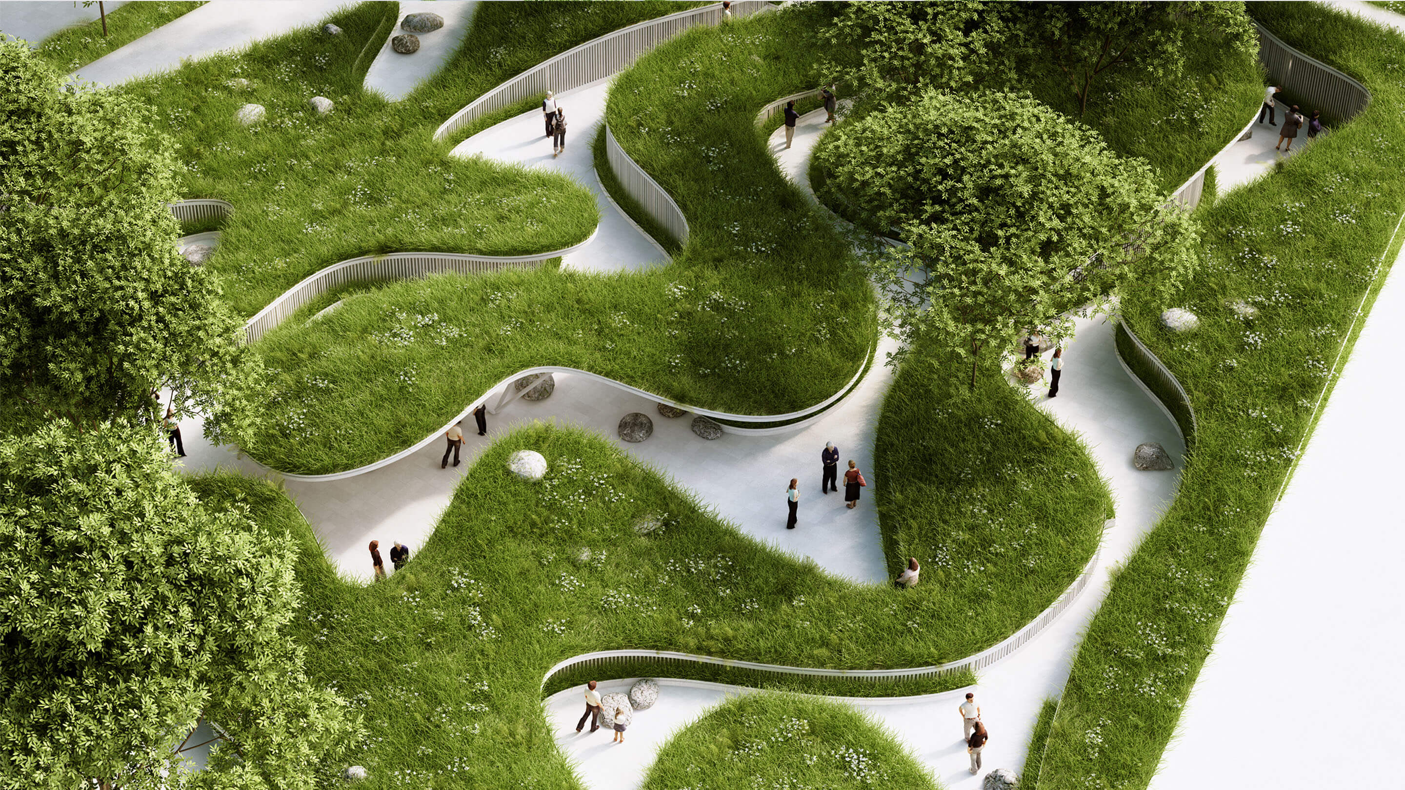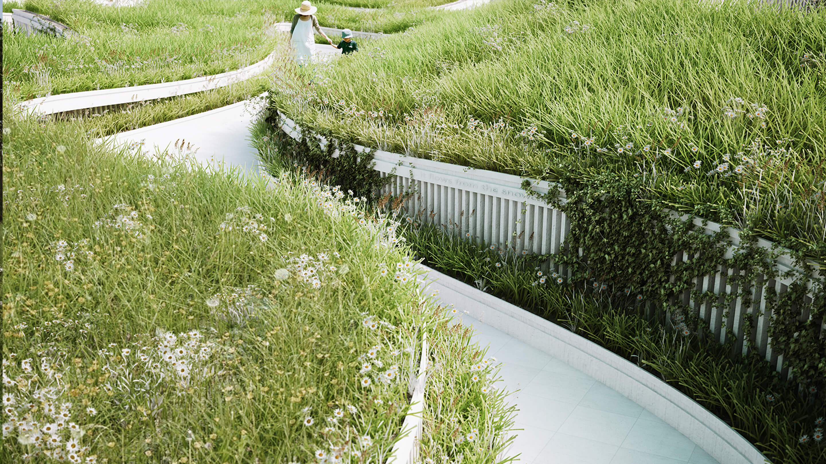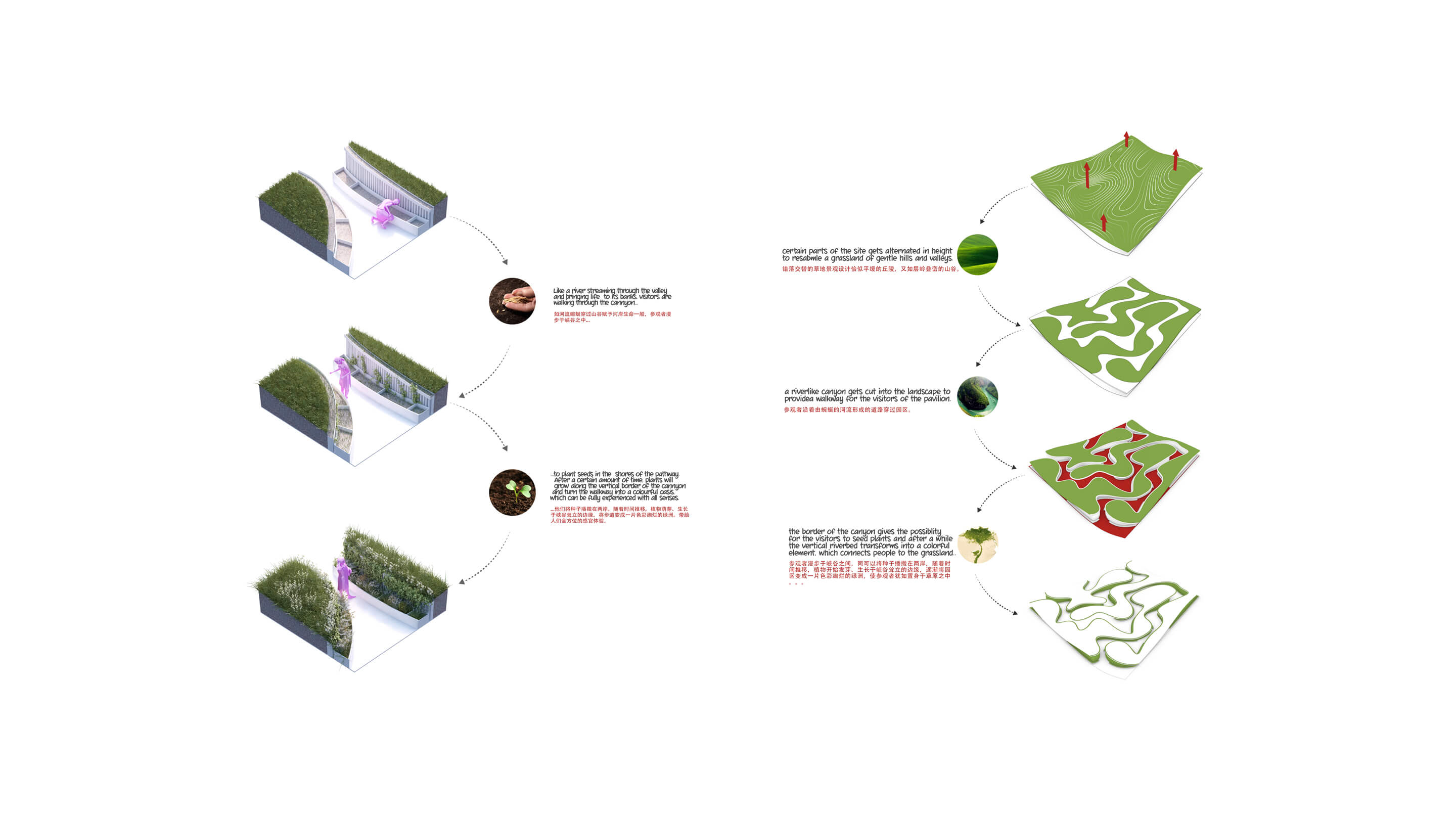 A river-like pathway guides visitors through an artificial landscape of hills and valleys. Seeds of different plants are given to the visitors at each entrance and they get the opportunity to plant local flowers, vegetables, fruits or herbs along the "riverbed".