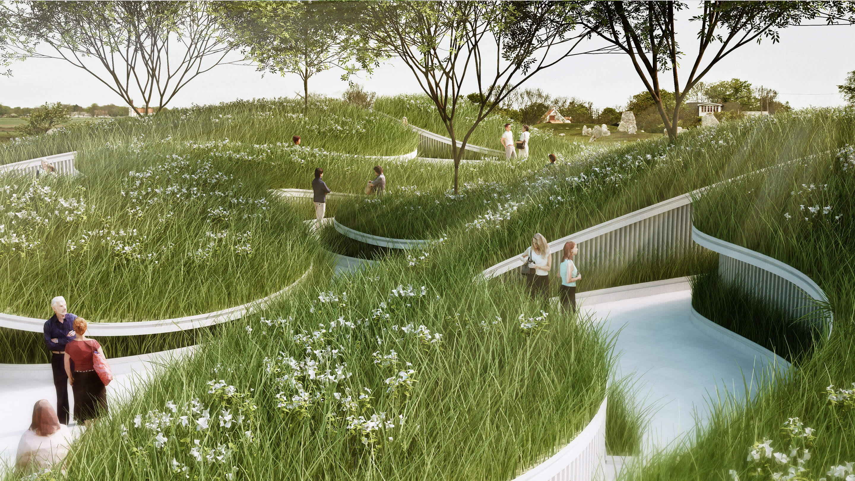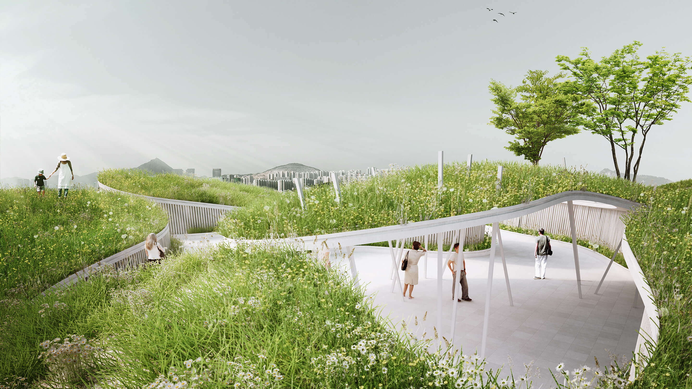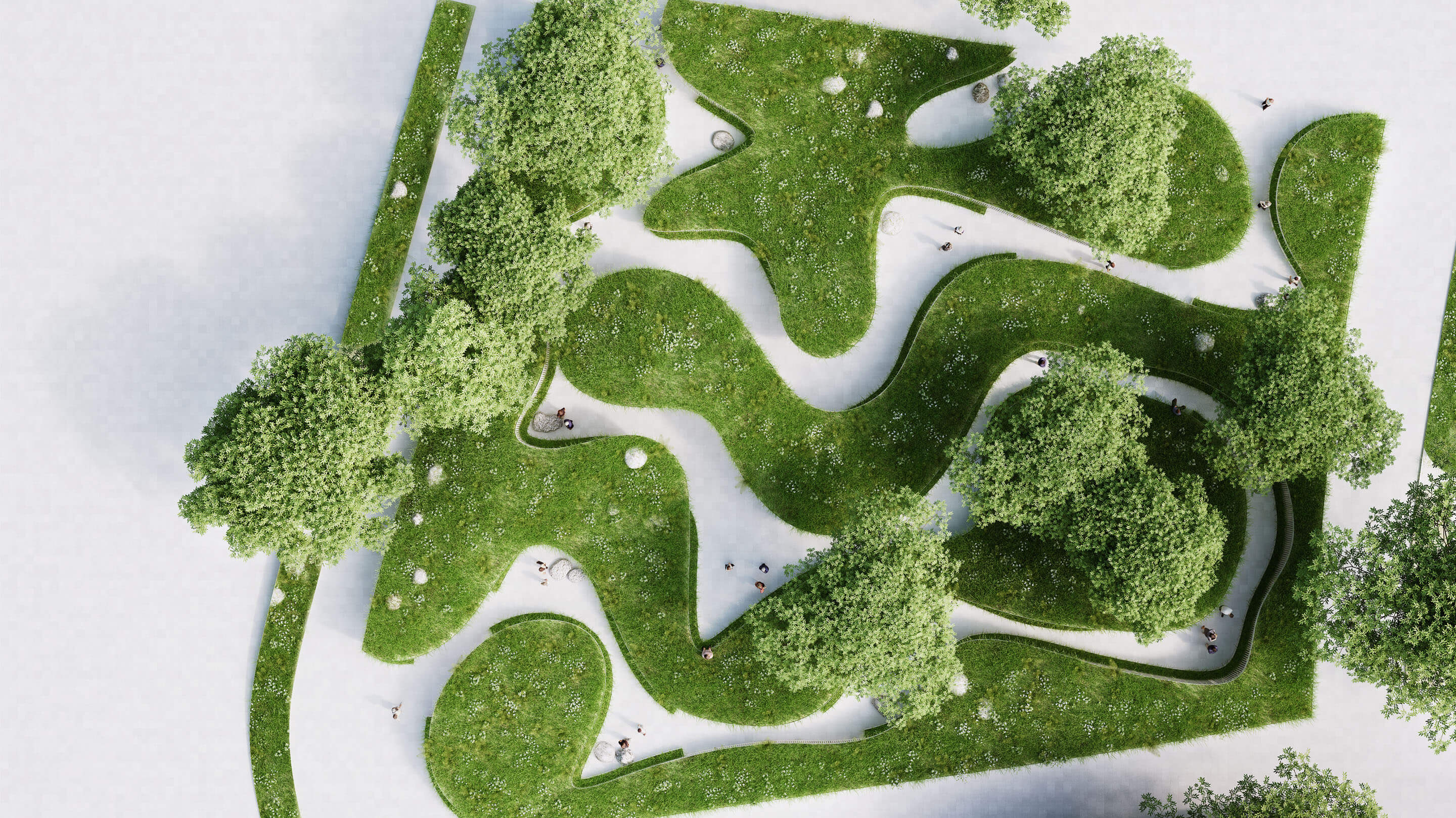 A river-like pathway guides visitors through an artificial landscape of hills and valleys. Seeds of different plants are given to the visitors at each entrance and they get the opportunity to plant local flowers, vegetables, fruits or herbs along the "riverbed".