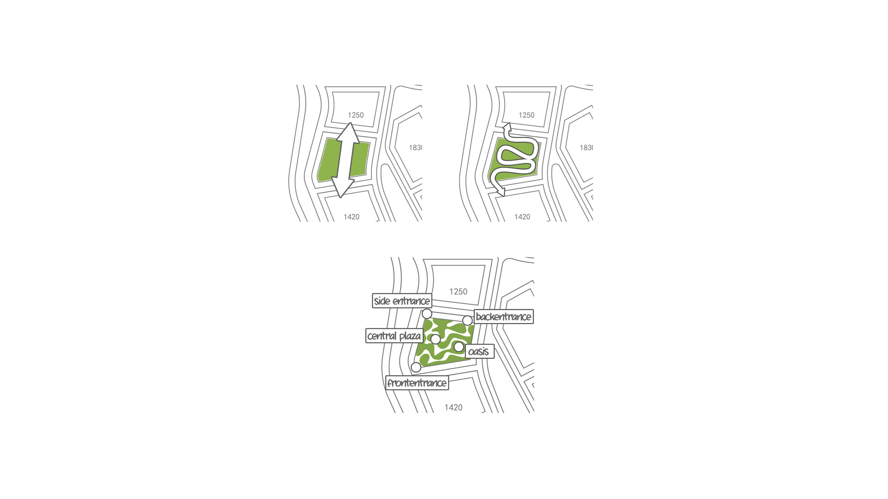 We see the location of plot 1590 as a connection inbetween other pavilions and it can be entered from 3 sides.