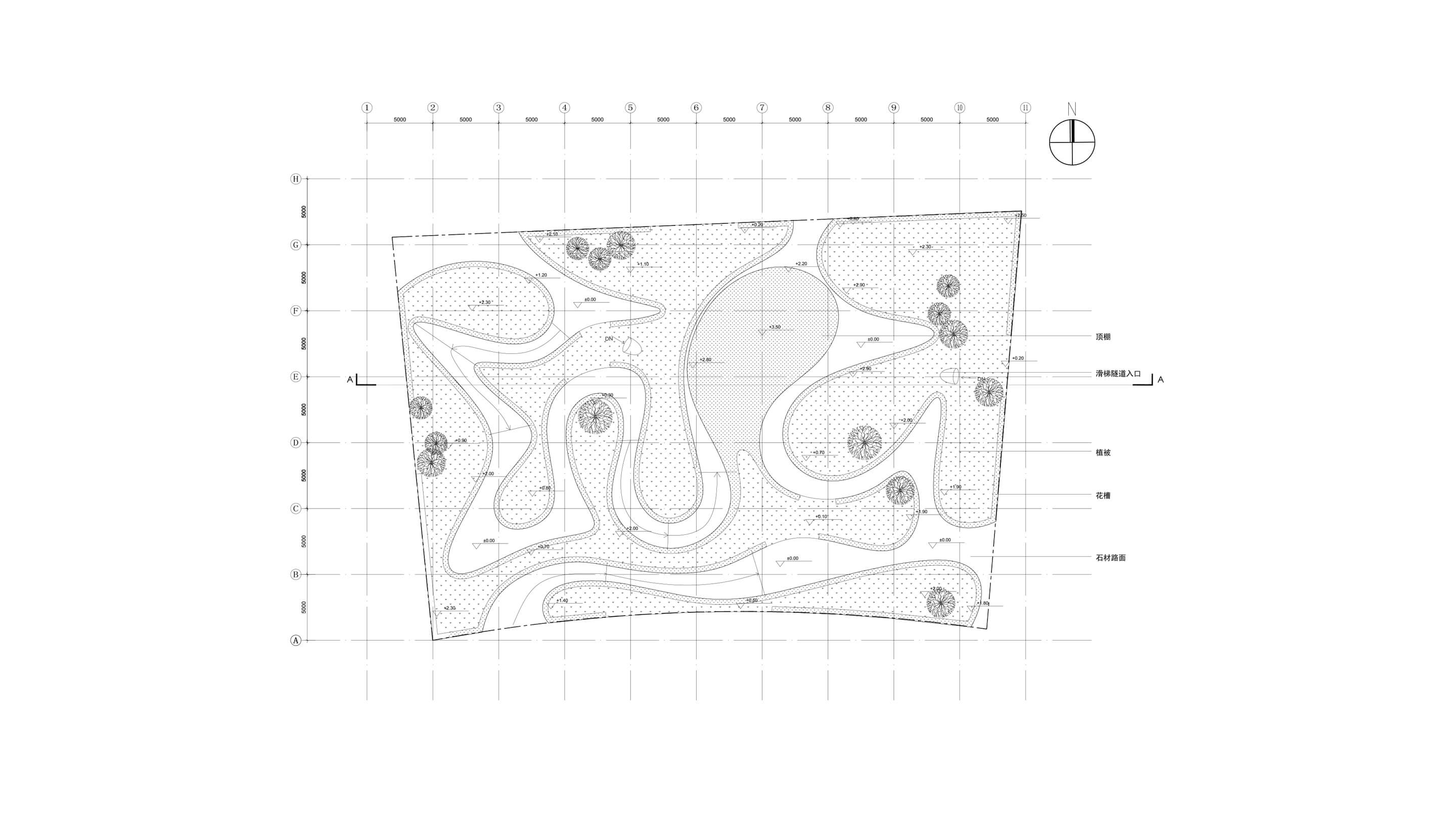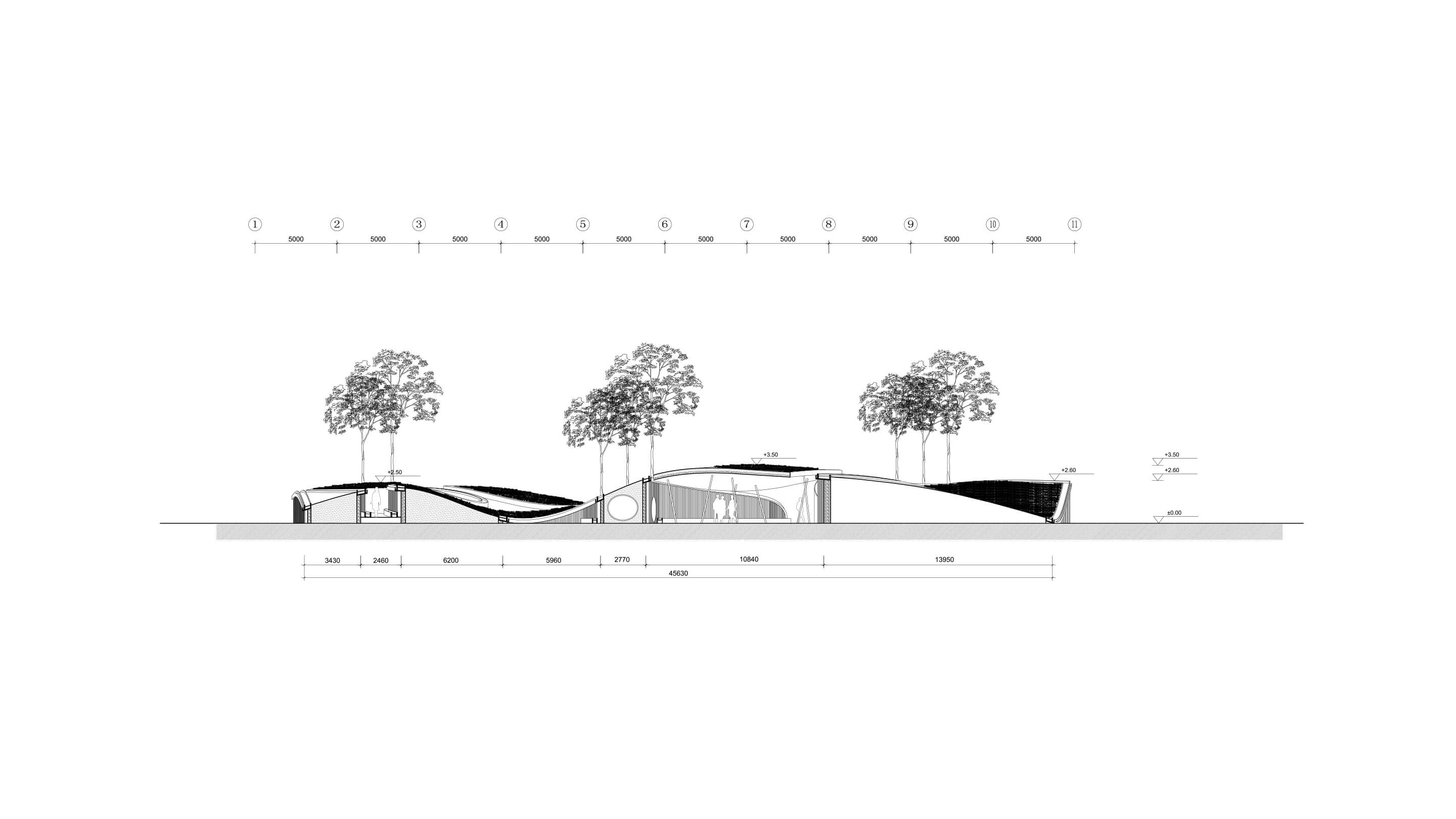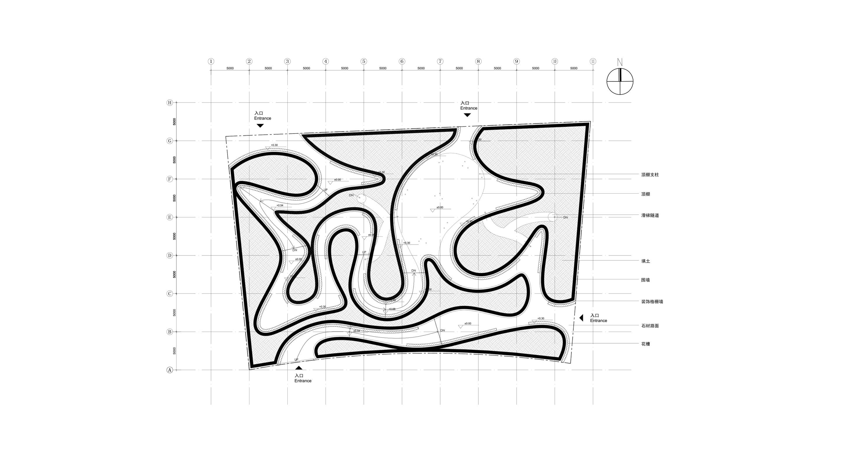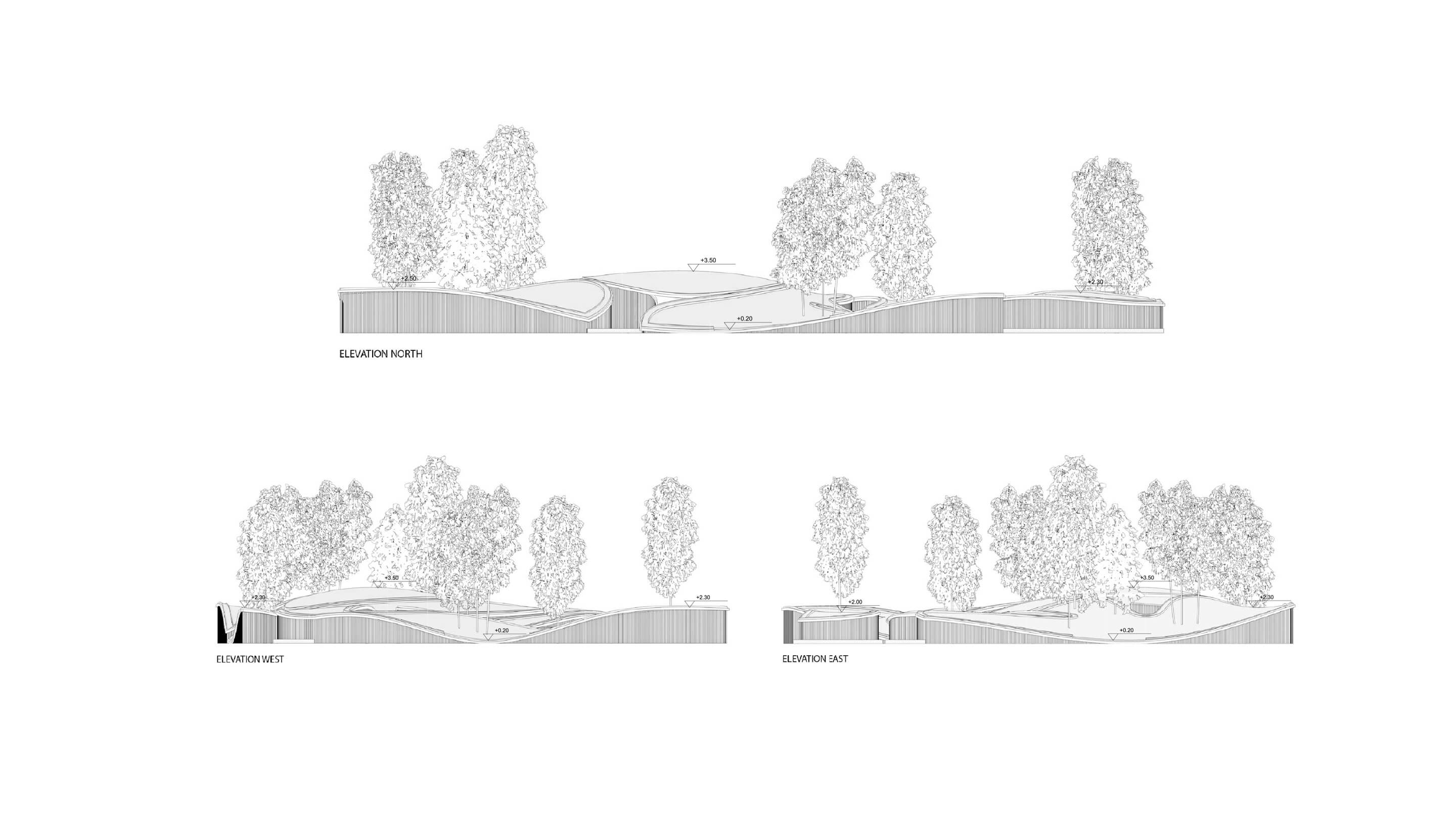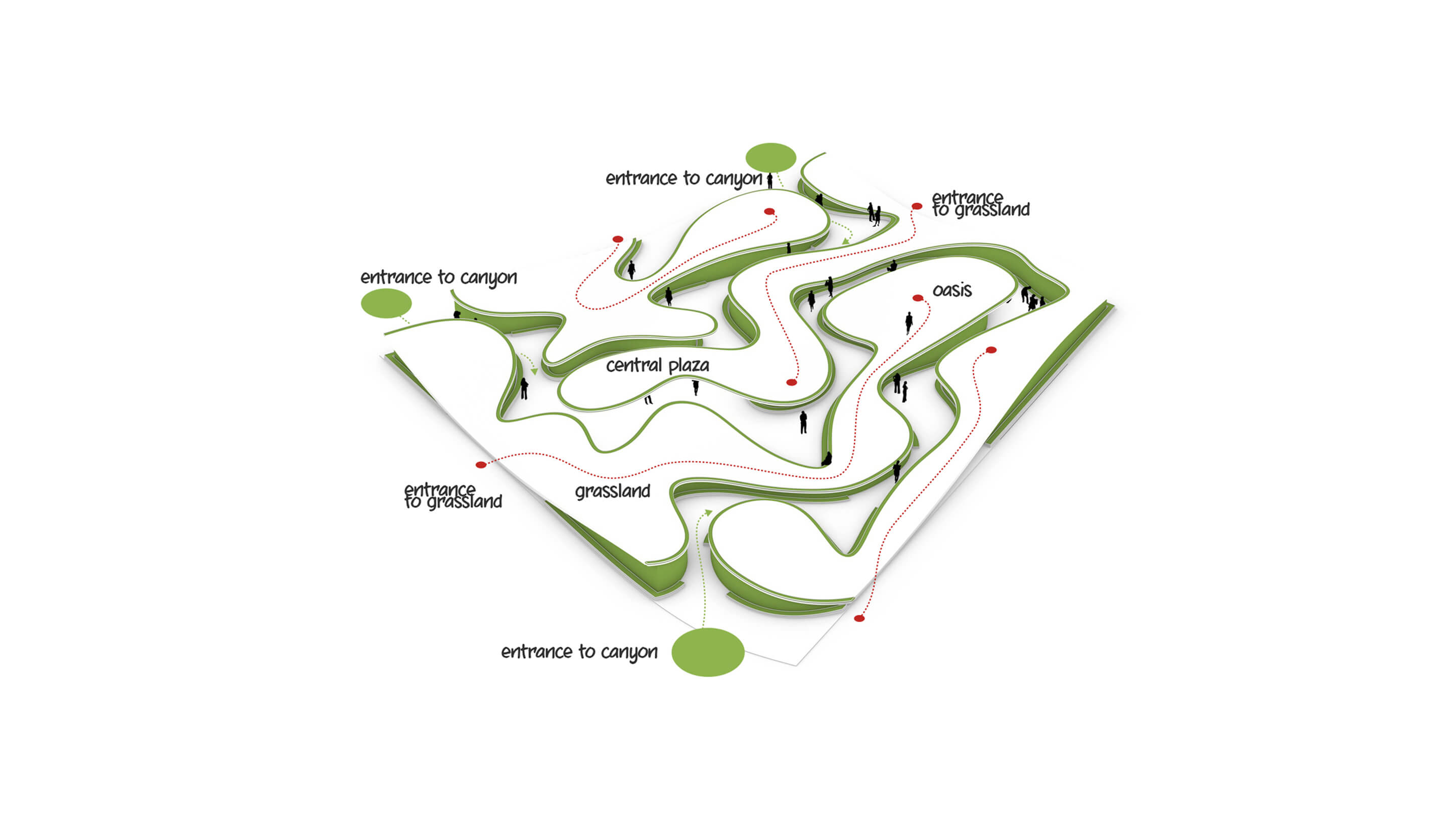 Visitors are naturally guided through the riverbed. On their way they will pass by various landscape formations, like a narrow shore, high cliffs or a natural cave. Troughout the walk, famous local poems and quotes are engraved into the vertical walls. All entrances are leading to the central plaza, where the visitors have time to rest, reflect or have a drink. A natural canopy offers shadow to the plaza.